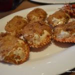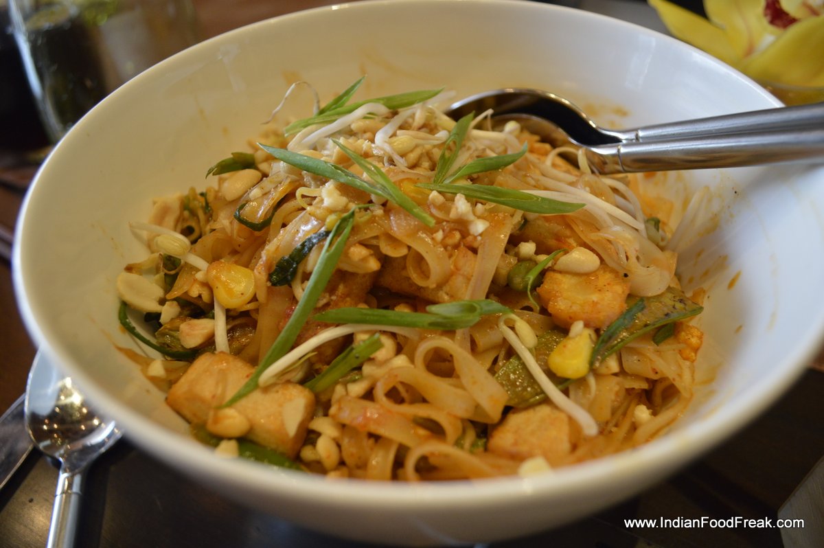 The appetisers followed quickly – the Crab cakes and the Thai tofu wrapped in betel leaf and served with plum sauce were the clear winners here. The Thai herbs blended perfectly with the crab meat, enhancing the flavours, yet retaining the sweetness. The Thai tofu in betel leaf was an evolved version of the Thai street food Miang Kham, designed to be eaten in a single bite, each wrap containing sweet, salty, sour, spicy and crunchy flavours and textures – a must try for vegetarians seeking fresh flavours from the Thai kitchen. The marinated chicken morsels wrapped in pandanus leaves were flavourful, but a softer texture, with the juices of the meat retained, would make them more appetising. The potato spinach fritters and the raw mango salad with chestnut were low on the innovative flavours that the palate had now got used too !