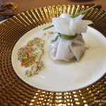 The refreshing lemon grass daiquiri and the amuse bouche, a delicate, translucent, steamed dumpling, redolent with the scents and flavours of lemon grass and galangal, served on a gold fluted plate, set the tone of the chef’s style and approach to the cuisine to follow – classic, flavourful and elegant.