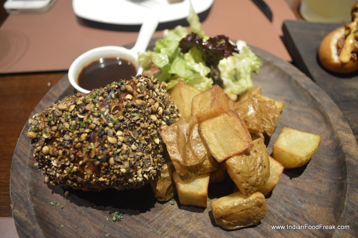 For the main course I strongly control my urge to try their famous burgers, instead I go for the two peppercorn steak. Tenderloin in India is basically buff and at most places go dry and chewy. Not here! I ask for a medium rare and I get exactly that. The tenderloin is marinated with bbq sauce and crusted pink and black pepper, and sprinkled with coriander seeds and rock salt. I love it.