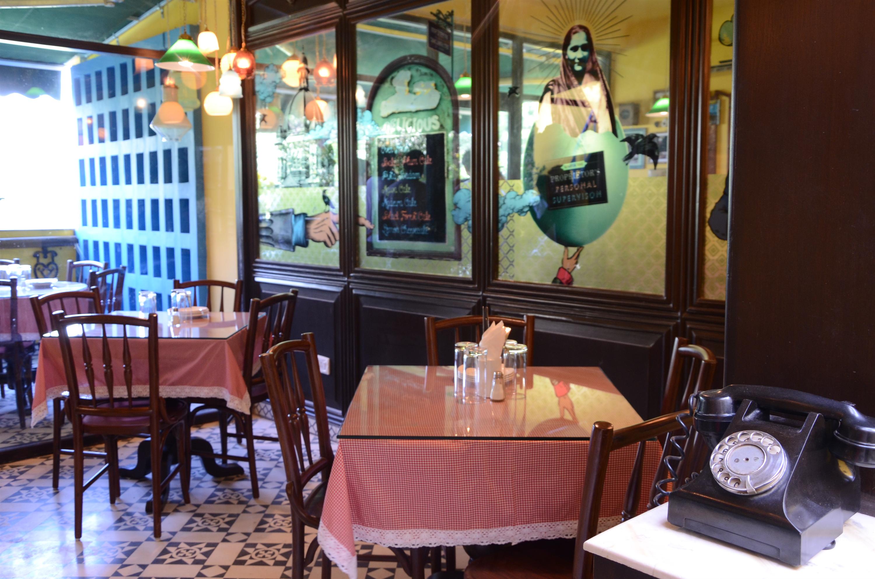 Keeping most original elements of a typical Irani cafe in place, architect Clement and fashion and interior designer Ms Sabina Singh, added a few contemporary touches. Their take of Parsi Style Freddie Mercury meets Monty Python on the large mirrors juxtaposes with a play of graphics all around.