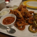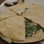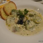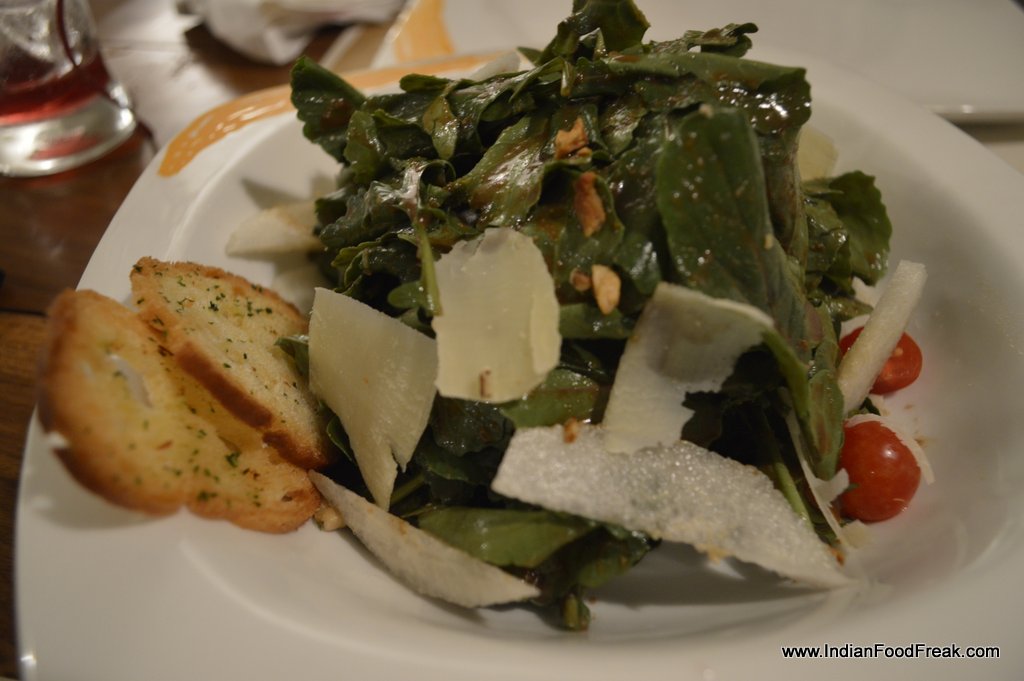 We start with a portion of Calamari E Zucchini Fritti with a mayo-based sauce. The fitters would be better if they are crunchier and less greasy. The portion of this appetizer is quite substantial though. Next comes the Insalata Rucola Con Pere or a salad of rocket leaves with pears and cherry tomatoes with walnuts in honey balsamic dressing. Unfortunately, this proves that too much of a good thing isn’t necessarily good! Completely out of balance, the huge portion of rocket completely overpowers the sweetness of pears or cherry tomatoes. And the dressing is in excess as well. We realize that the grainy texture in the dressing comes from walnuts that have been pounded to a powder.