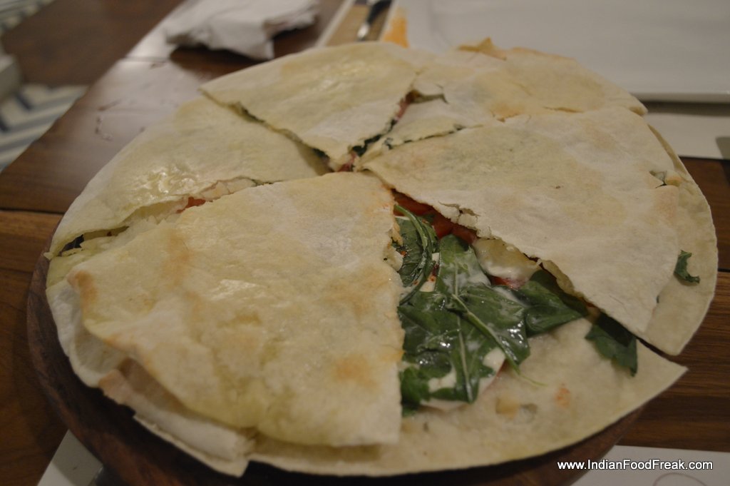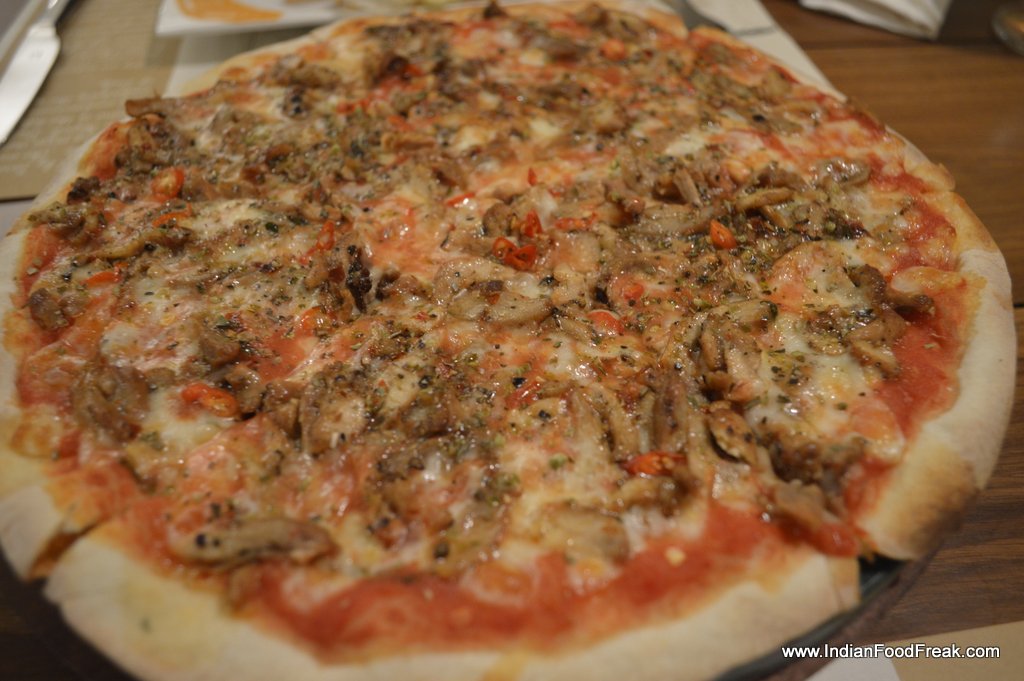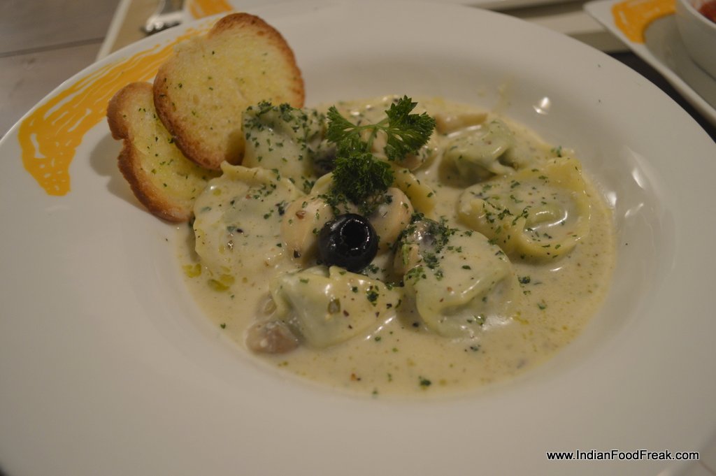 Then we go with the chef’s recommended Pizza Sandwich that is also highly commended by the manager. We opt for the non-vegetarian version with tomatoes, buffalo mozzarella, Parma ham, rucola and basil oil. Somehow it doesn’t work as either pizza or sandwich and we can’t decide whether it tastes better with the top base or without. The only flavours that stand out are the cheese and tomato and Parma ham is literally lost amongst all the other ingredients. The Tortelloni di Ricotta Spinaci Pavarotti is a doughy tortelloni stuffed with spinach and very little ricotta. The creamy mushroom sauce and herb oil is quite tasty though, and the dish would do well with a bit more of the sauce.
