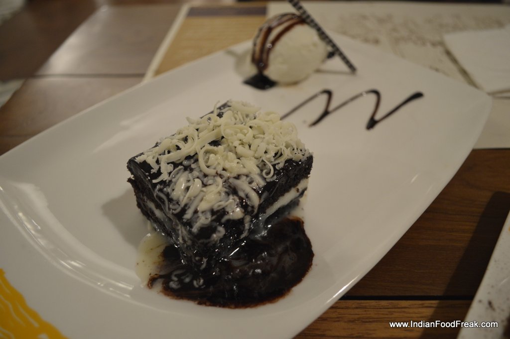 The café has a decent offering of coffee, both hot and cold, that we didn’t try. The desserts though are nothing spectacular. While the Tiramisu has a good bitter-sweet flavour, the cream is a tad dense. The Chocolate Lasagna however is a misleading name for warm chocolate cake layered with white chocolate, topped with hot chocolate sauce, accompanied with a small scoop of vanilla icecream.