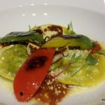 The entrees called Eisodos, was a duo of challenging choices of Homemade Pasta with Jumbo Prawn and Creamy Sea Bass emulsion or Spinach and Feta cheese Ravioli with roasted peppers and grilled halloumi cheese. The risotto like bed was actually thin homemade pasta finely chopped and emulsified in sea bass cream which artfully dodged our perception of it being rice risotto. The spinach and feta cheese ravioli held its own court with the vegetarians amongst us.