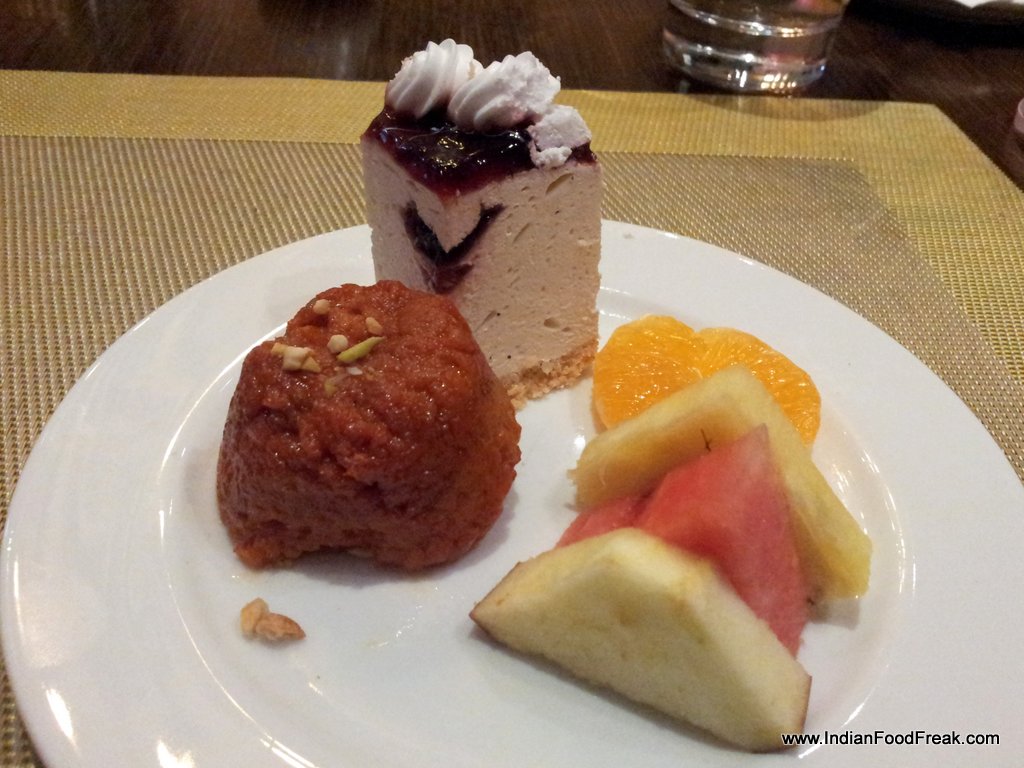 Chicken Steak with Mushrooms and Red Wine SauceFor the mains, my friend requested for the Chicken Steak with Mushrooms and Red Wine Sauce while I ordered the Tandoor Grilled Chicken in Honey Makhani Sauce with Jeera Aloo Scoops and Chicken Dum Biryani. As they say, we first eat with our eyes and I was extremely pleased with the way the dishes were presented. They did not in any way fall short in flavor either. We finished the meal with Blue Berry Lemon Cheese Cake, Gajar Halwa and a variety of fresh fruits. The Blue Berry Lemon Cheese Cake was the regular kind but Gajar Halwa was the dessert that stole my heart. Not overly sweet, it felt perfect on the palate.