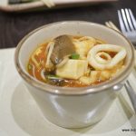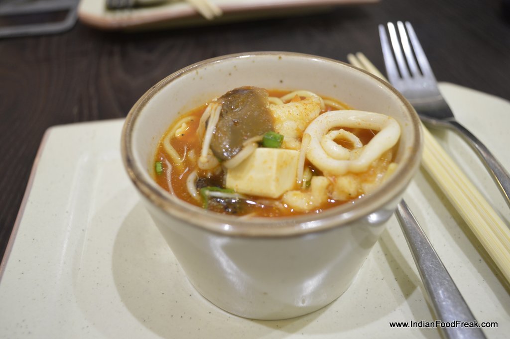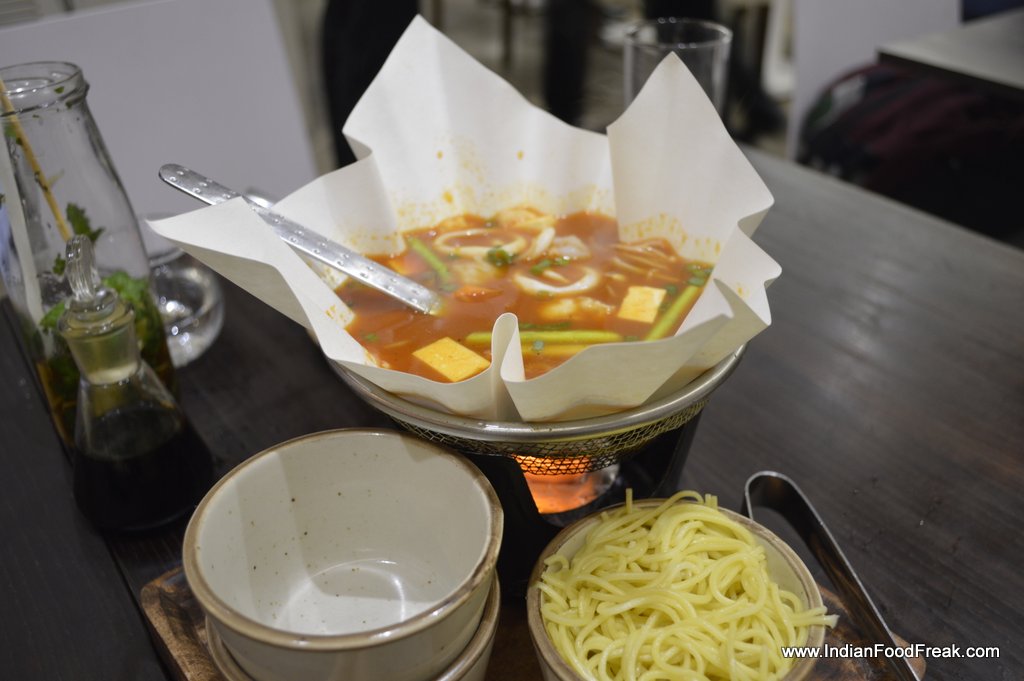 We also tried some mains like Chicken in Spicy Black bean sauce (Rs.250) and Vegetables in Celery Wine Sauce (Rs. 220) along with Burnt Garlic Fried Rice (Rs.230) which were quite decent. The Chickenin spicy black bean sauce and the burnt garlic fried rice was an amazing combination and I was quite capable of polishing it off completely by myself had I not already stuffed myself with the sushis and dim sums. Another very novel and interesting product we tried was Seafood in Paper Boat which is a soupy noodle dish served in a paper boat with live fire under it. The novelty of the dish starts and ends with the visual of fire under a paper boat as the soupy noodles, though loaded with seafood, tend to be heavy on the stomach. It is quite a wholesome dish and can be a quick single dish meal for a person in a hurry.