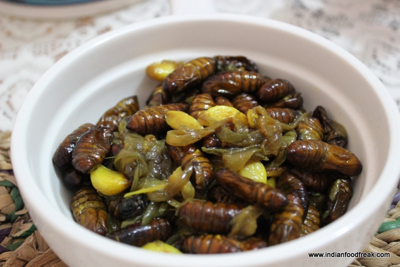 I recently had a chance to try her New Harvest special lunch which was organized by Meal Tango where she had brought in special greens and meats from villages of Assam which included pigeon, geese and hold your breath – the creepy silk worms !