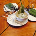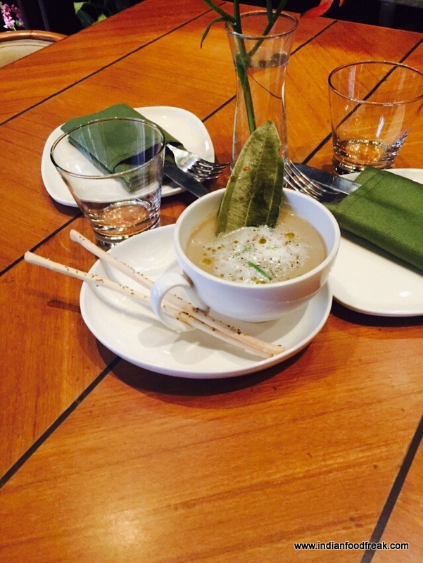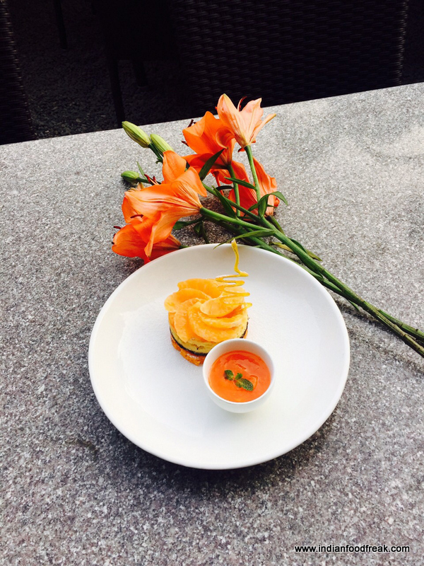 We are introduced to the chef’s winter menu on a sunny December afternoon. I am led from the pebbled patio, with al fresco seating, into luxe interiors. The high ceiling and wall-to-wall library that fluidly shifts from a liquor cabinetry to a culinary archive and eventually into a food cabinetry are the highlights of this space. The interiors are seamlessly divided into two sections – a lounge with low tables and a bar area and a restaurant section. Dappled sunlight streams in through glass walls and I can’t help but wonder why we’re sitting indoors on such a gorgeous day.