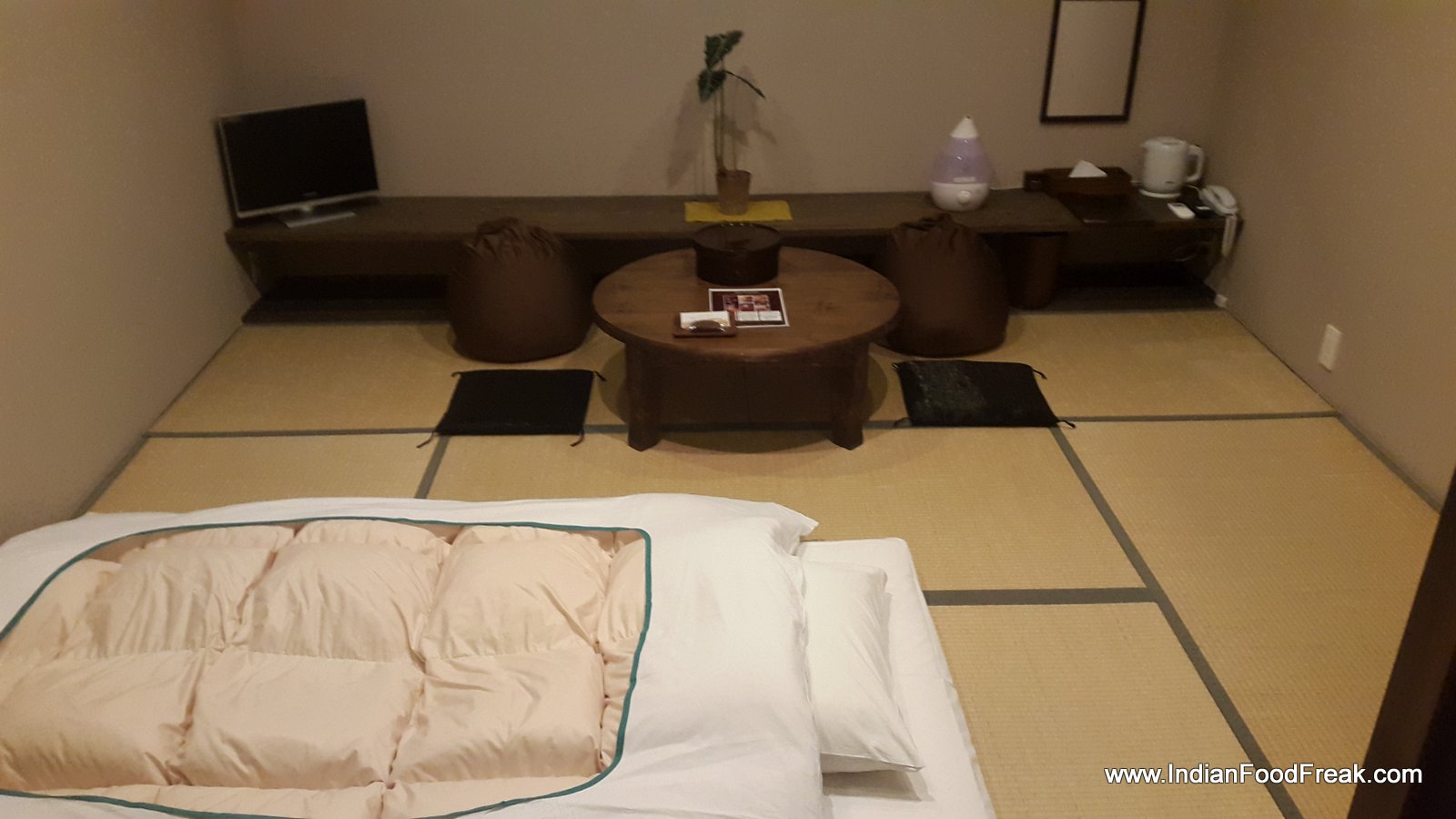 The day ends on a magical note. We are taken to Aqua Ignis hotel in Komono town. Set in a picture perfect background, Aqua Ignis denotes water and fire. An abode for those longing for hot spring (Onsen in Japanese) baths, it even boasts of personal resorts with private hot spring bath pools – an ideal getaway for the newly married. The lesser mortals like us stay in the normal room that had no bed but a mattress on the floor.