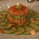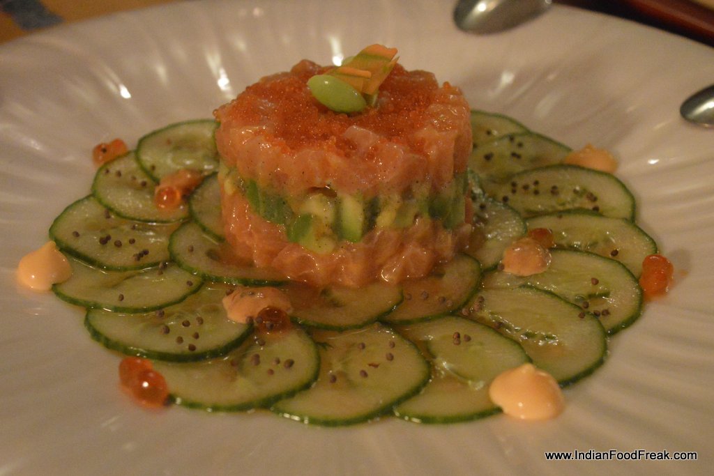 _DSC0010Salmon Tartare marinated with diced avocado was buttery smooth with the house flying fish roe and bonito mayo lending bursts of textures and flavours. The seafood Nigiri with crunchy vegetables is more than a mouthful of excellence. The individual piece however is a little too big to chew on comfortably at one go.