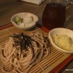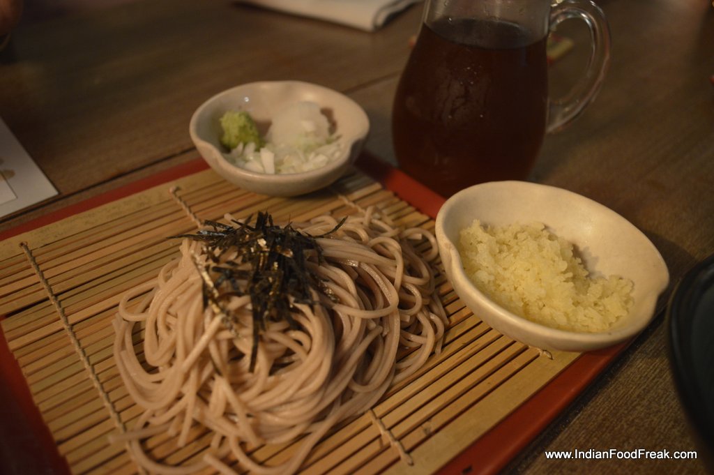 Zaru Soba Cold Noodles are served with tanuki, scallion, wasabi, ginger and cold bonito soy sauce. Tanuki means a raccoon dog in Japanese but rest assured that what is served here is no canine meat but a refreshing, healthy, tasty noodle dish with warm notes of wasabi and ginger.