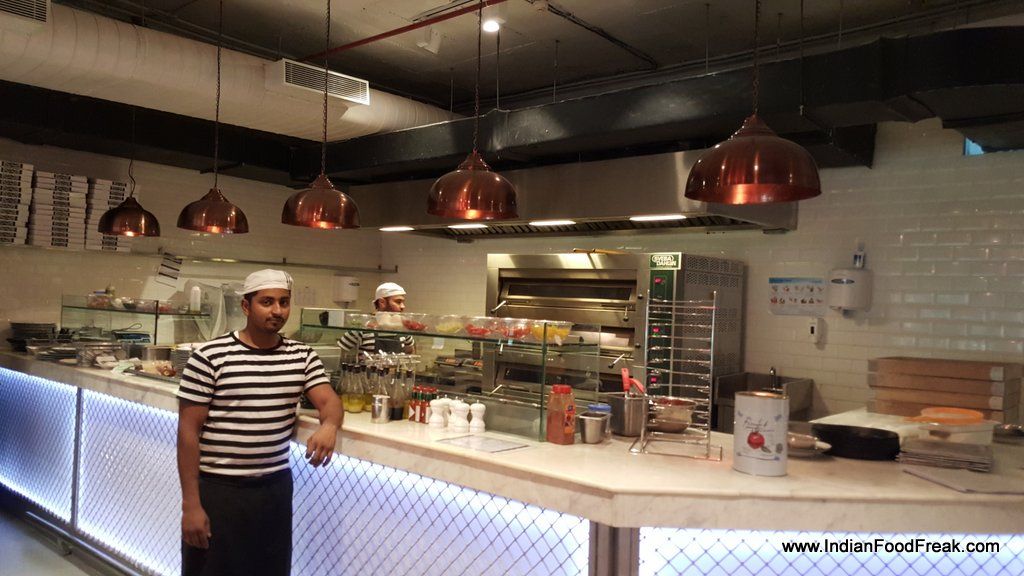 The décor at their Ambience mall outlet was stark, airy and light with their iconic white and black stripes everywhere, brightened by Murano? glass lampshades and copper shaded lights, bringing the world famous floating city Venice to mind even though the flat bread dough boasts of provenance from another Roman city. Cutlery and table service is designed by Robert Welch of UK inspired, perhaps, by the origins of the founder Peter Boizot (the chain is now Chinese owned).
