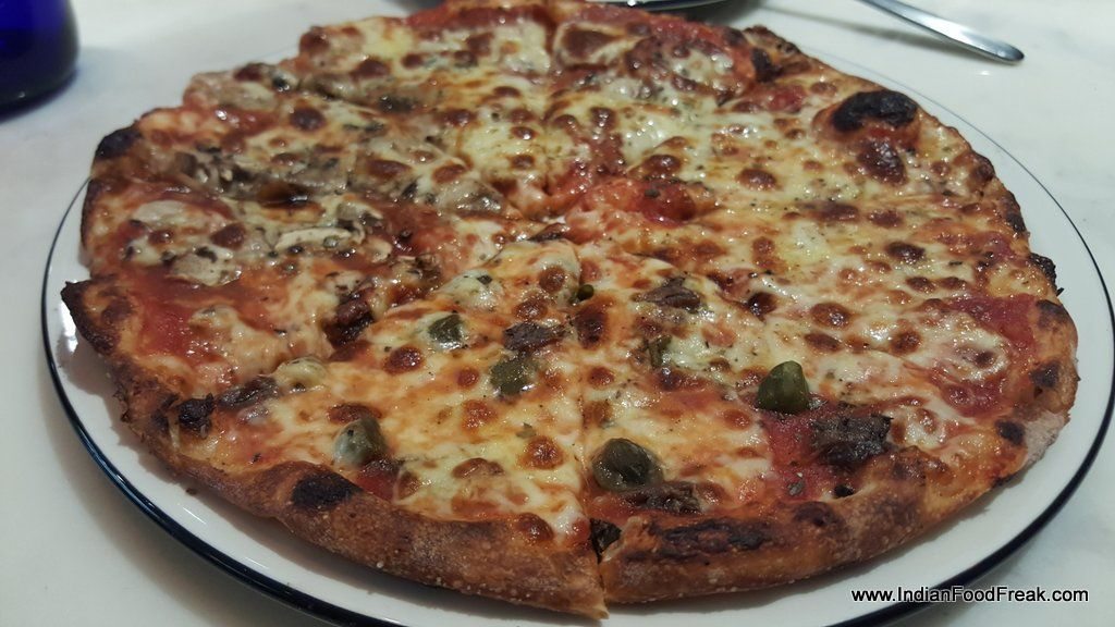 he Margherita pizza was simple soul food – tomato and cheese in perfect harmony with each other. Four Seasons pizza on a classic crust was fabulous – it was spongy and juicy and the briny capers and anchovies were fighting for favour with the mild heat of piquant salami and mushrooms.