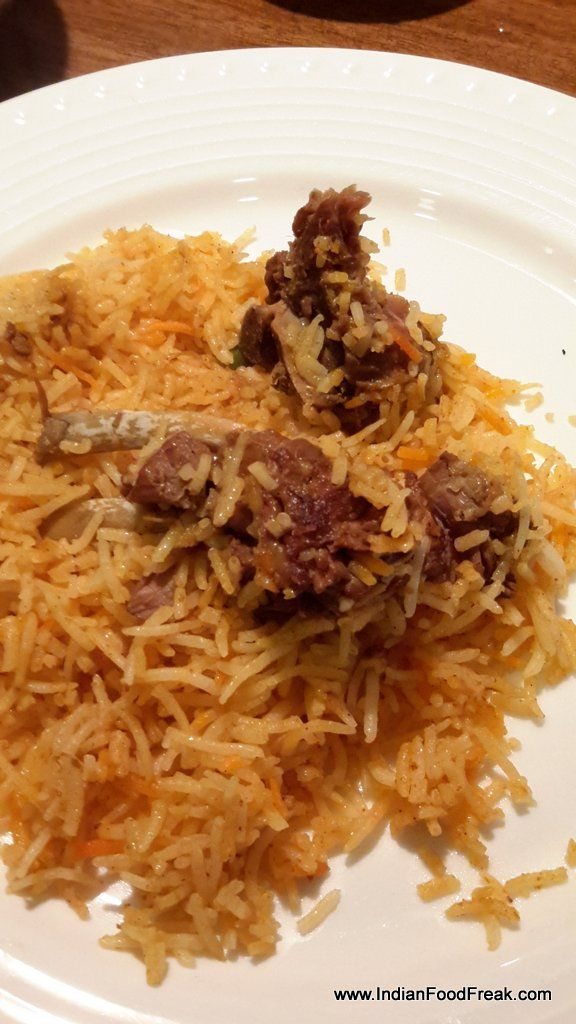Mutton Biryani was the next dish that made it to my table. It was served in an earthen pot with a lid sealed with atta and the whole thing covered with a foil. The minute you open the lid and unveil the biryani, the aroma of kewra, itr and saffron totally engulfs your senses. The biryani had long grains of rice with each grain separate and the rice hiding perfectly cooked mutton within it. The subtle play of flavours was a treat for the taste buds.