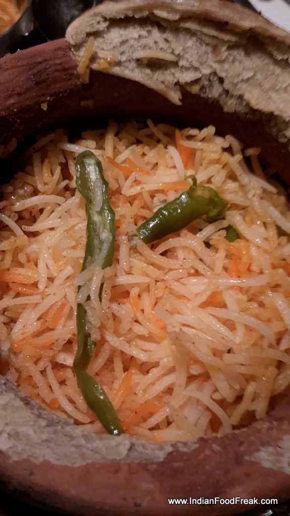 Mutton biryani 2Mutton Biryani was the next dish that made it to my table. It was served in an earthen pot with a lid sealed with atta and the whole thing covered with a foil. The minute you open the lid and unveil the biryani, the aroma of kewra, itr and saffron totally engulfs your senses. The biryani had long grains of rice with each grain separate and the rice hiding perfectly cooked mutton within it. The subtle play of flavours was a treat for the taste buds.