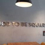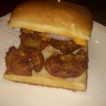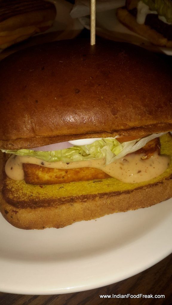 Greek falafelFor the burgers, they use three different buns – chili brioche (which is turmeric and chili flake infused), regular burger bun and black and white sesame seed topped bun. They use square buns and square patties so that the patty is the same size as the bun as far as possible and also because a square patty cooks better when you press it down.