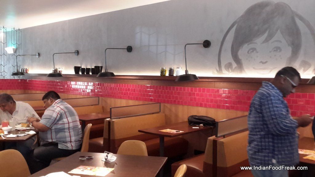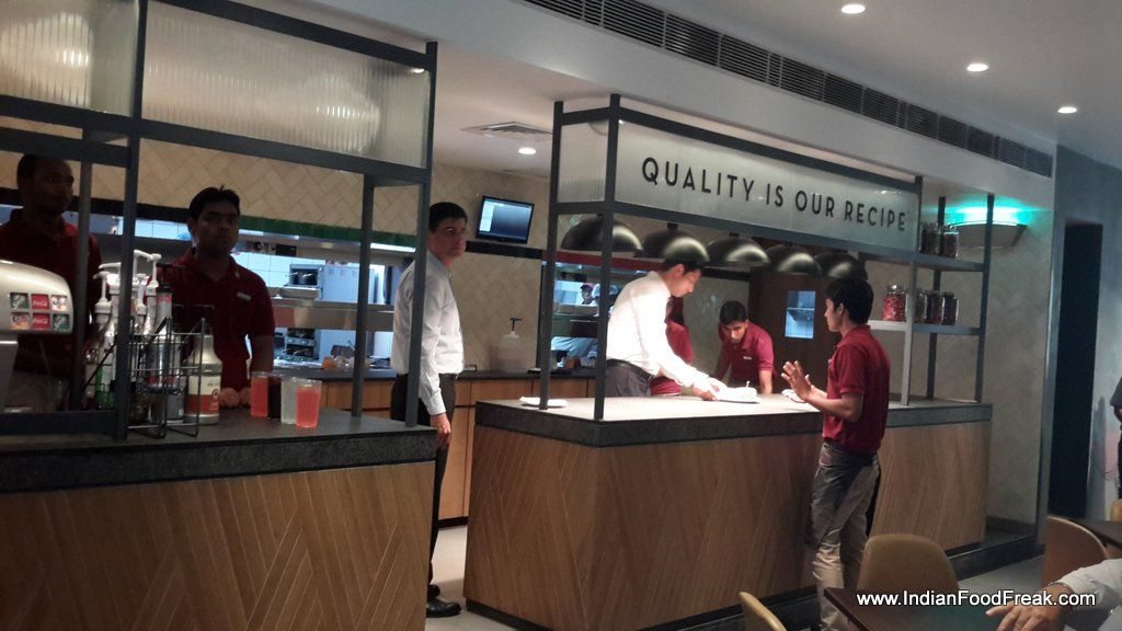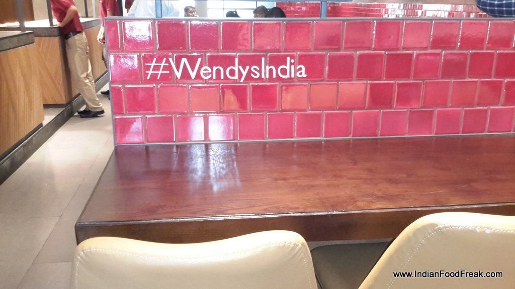 Wendys interior shotA quick tour of the kitchen impresses me no doubt. They use the freshest of ingredients sourced locally and their non-veg is sourced from Godrej to maintain quality. There is a clear demarcation between the vegetarian and non-vegetarian work stations, the chefs wear red/green aprons respectively, different oil is used for the two, there are different assembly areas of the veg and non- veg burgers and even the tooth picks used for the burger have a red/green bead attached at one end.