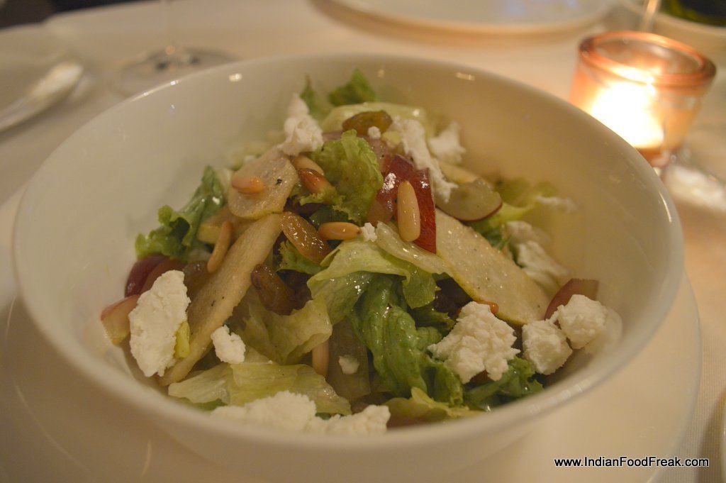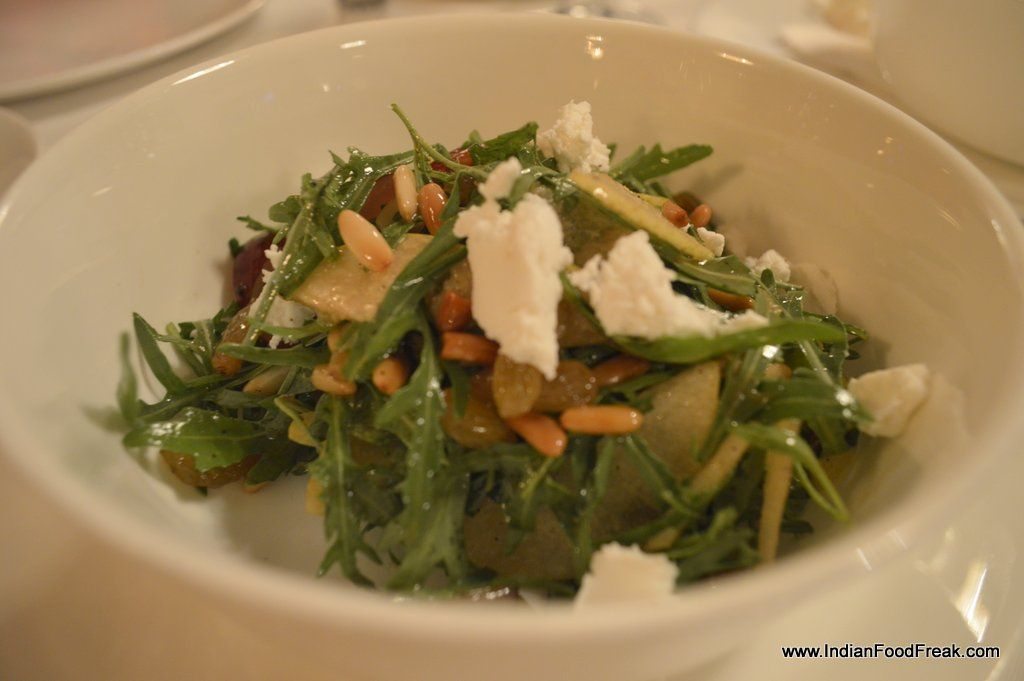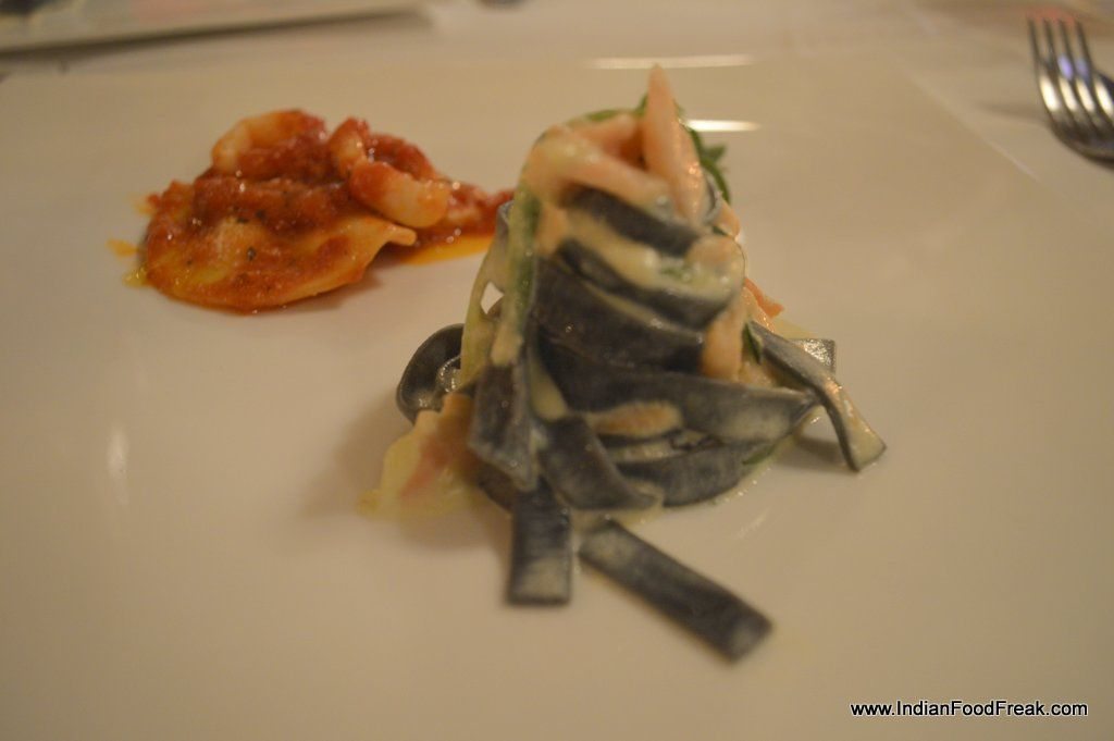Crostini ai Fegatini with chicken pate and caramelized onions was much appreciated by my companion though I gave it a go-by as I am averse to anything related to liver. The dulcet dressing of citrus fruit juices, the tang of capers and the aroma of fresh oregano and fennel added an exotic and pleasant taste to the sashimi grade tuna in Tonno Carpaccio. Tartafutta, a summer special of fresh salad leaves drizzled with truffle oil served on a Parmesan cheese filigree basket, was refreshing but what took the cake or should I say the salad bowl was the Ferro Salad – the most tender, pungent arugula teased by grapes and slices of crisp pears and topped with goat cheese and toasted pine nuts- delightful ! This is surely a not to be missed salad.