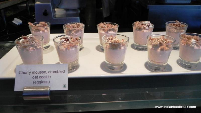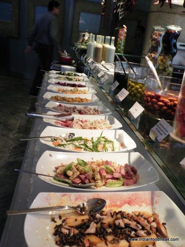 On recommendation, I tried the Cucumber and Basil Bramble. Made with cucumber juice, muddled basil, lime, sugar and Bacardi, I can safely say that it was indeed one of the best cocktails I have had in the longest time. The other cocktail, Orange Delight, was not much to write about though. The soups on offer were Tomato Soup and Chicken Soup; both wholesome and filling. The salad and cheese counter was extensive. I must specially mention their superbly fresh salads such as pumpkin walnut and feta salad, ham and sweet potato salad and the calamari and fennel salad.