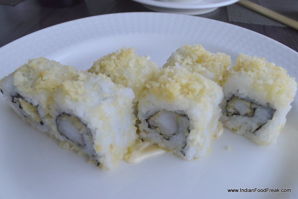 Japanese Prawn and Veg Tacoyaki are like our south Indian Puddu with a wheat flour base and both were lovely. Do try as many sushi and dimsum as your stomach permits.
