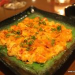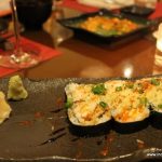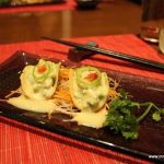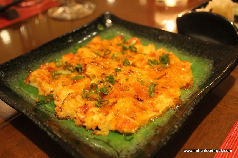 The Lettuce, Avocado and Tofu Salad had a mirin and soya based dressing which was tangy and bit sharp but quite refreshing on a summer evening. We were also served a platter of Baked Crabs topped with salmon roe  along with a creamy sweet and tangy sauce which was quite addictive and I had to literally force myself to stop and move one to the next dish which was a  Platter of thin slices of hamachi fish in a ginger and ponzu sauce. The raw slices of the fish were complimented very well with the delicate and extremely aromatic sauce and I licked off the platter within no time. This certainly shared the spot for the best dish along with the baked crabs.