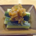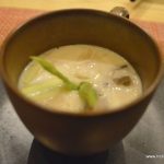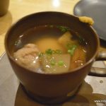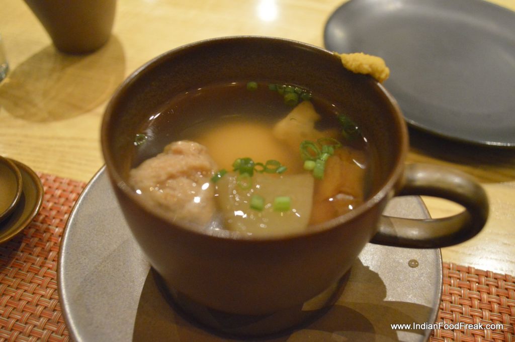 Instead of going only with Sushi, we sit at the Chef’s table (a table inside the kitchen of the restaurant) where Chef Hashimoto serves a special tasting menu every Saturday. The menu is moderately priced at Rs. 3,500 inclusive of IMFL though we order some of the things apart from the tasting menu too. As a palate cleanser, we are served spicy wheat miso with wasabi and cucumber. If you have never experienced the umami flavors, this dish will help you understand the term.