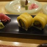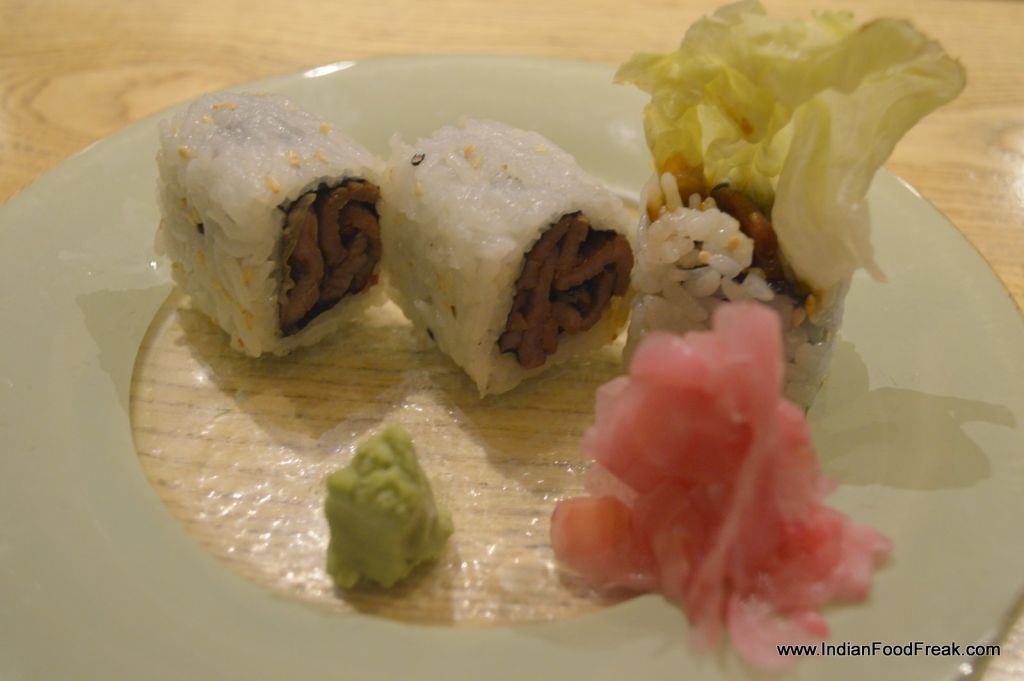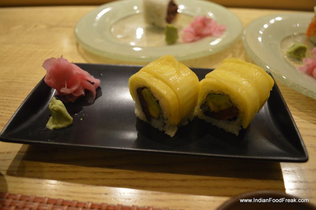 Taran Tura Rolls are soft shell fried crabs with iceberg. They are topped with expensive (nearly Rs.10,000 per packet) flying fish roe that adds to the crunch and taste. The iceberg is just on two of the six sushis and if not on the sushi, I would like it to be served on the side to get a similar bite in every roll.