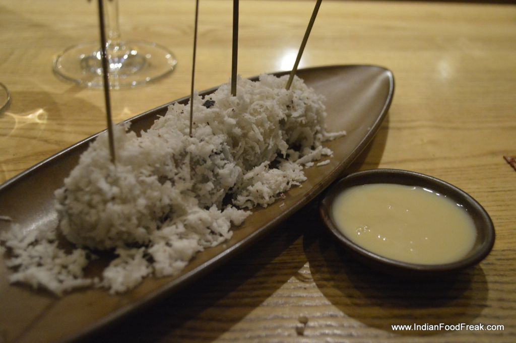 To end the meal one can go for the mango sushi that also has avocado and tomatoes and uses gari water. But if you are in the mood for something experimental, ask for the Choku Dumpling from the Thai Kitchen. It is basically a chocolate dumpling made in rice flour and steamed. Topped with grated coconut and dipped in milkmaid, you won’t ask for a better ending.