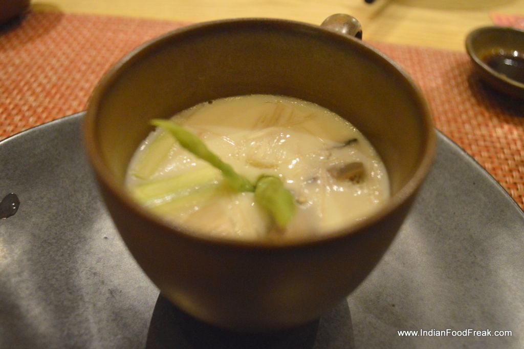 Instead of going only with Sushi, we sit at the Chef’s table (a table inside the kitchen of the restaurant) where Chef Hashimoto serves a special tasting menu every Saturday. The menu is moderately priced at Rs. 3,500 inclusive of IMFL though we order some of the things apart from the tasting menu too. As a palate cleanser, we are served spicy wheat miso with wasabi and cucumber. If you have never experienced the umami flavors, this dish will help you understand the term.