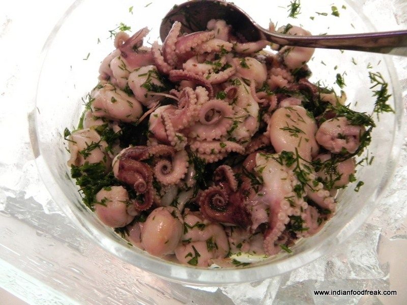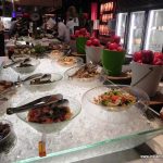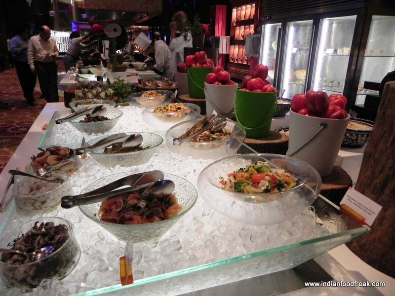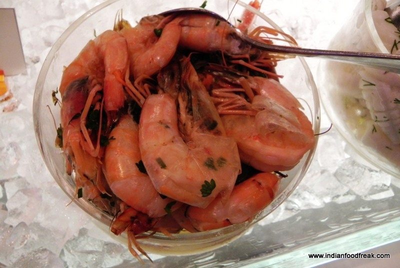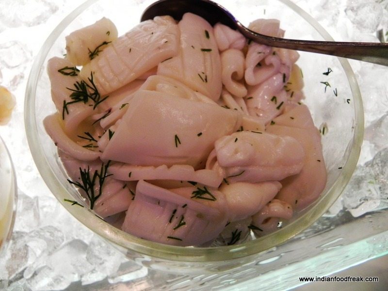 We started with the Sashimi and Sushi Rolls. The Sashimi was cut thicker than the usual. The Sushi seemed like it was made a while ago and was not as tightly rolled as one would expect. The rice seemed a little dry which lent a very unsavoury texture. The flavours were average. I was expecting some wonderfully made Wasabi sauce but was disappointed there too because it seemed like readymade bottled paste rather than a freshly made one. I would have been better off had I chosen the Fresh Fish counter from their buffet which had lightly blanched squid, prawns and octopus in some herbs over this.