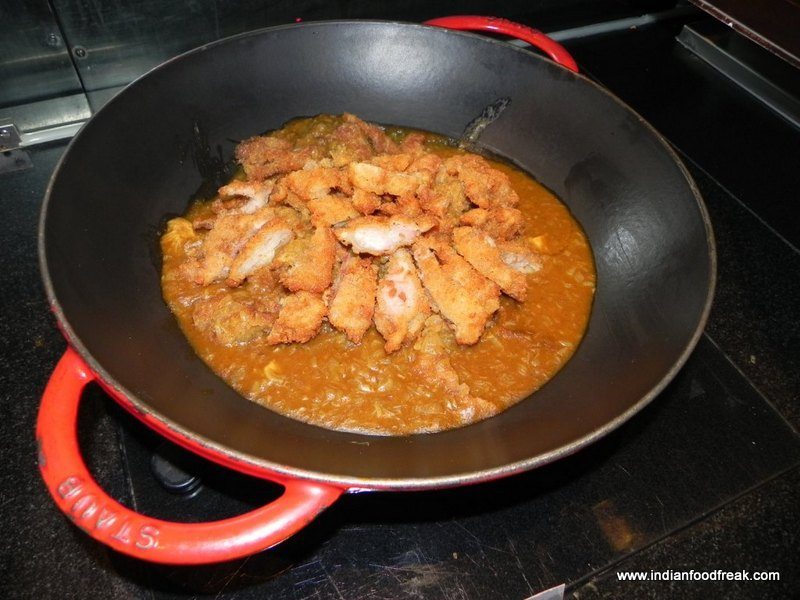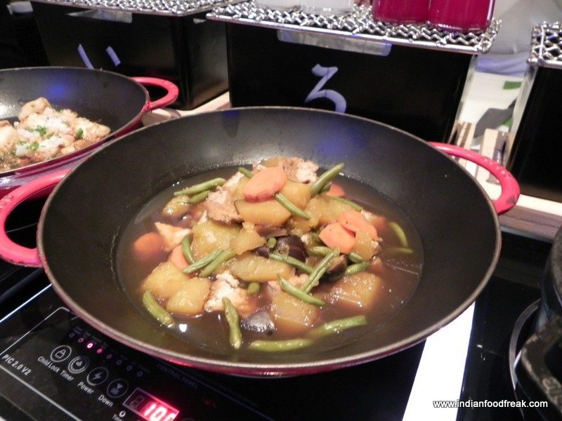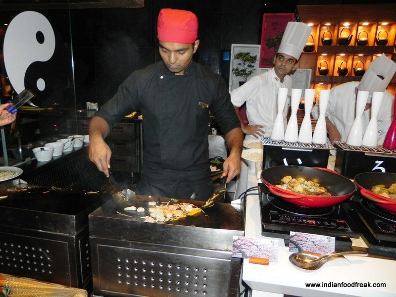 Agedashi Dofu, deep fried tofu in soy and Dashi sauce was a delight even for a non vegetarian like me. Yasai Nimono, assorted vegetables in the hotpot made me yearn for some chicken and prawn . Sakana Miso Zuke, grilled Miso marinated fish, had great flavours but could have done with some extra seasoning. Katsukare, breaded pork in curry sauce was another disappointment. The curry, though well flavoured, took a beating because of the stringy overcooked pork. The live station serving freshly made noodles with a choice of prawns and vegetables was a delight to watch but lacked in taste and flavours ..