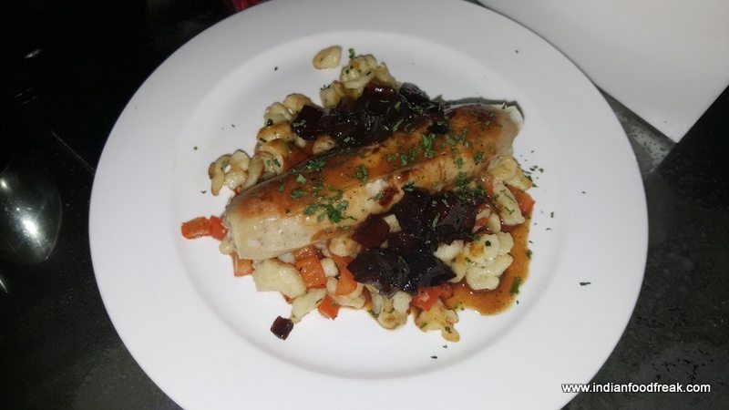 However the next dishes – Barbecue Chicken Waffle burger (Rs.475) and Grilled German Bratswurst (Rs.645) recaptured the lost glory. Chicken fillet slammed between two slices of savoury cornmeal waffles served with a fried egg and a mild sweet barbecue sauce was surely an interesting take on both waffles and a burger and I just couldn’t put the burger down. I kept wishing that they had added bacon to this beautiful burger as well. The brats were of the readymade kind but not bad, what really made the dish stand out was the bed of grilled apples and vegetables on which it was served, which worked well as an accompaniment and paired well with the Diablo.