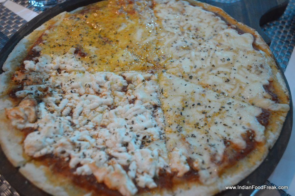 3 cheese pizzaTheir three cheese pizza (Mozzarella, cheddar and goat cheese) is very different. Instead of mixing all the three cheeses, they sprinkle each cheese separately on each pie. It helps in getting the flavour of each cheese – the purpose of mixing cheese gets defeated where some cheese may provide the stretch and other cheese impart flavour.