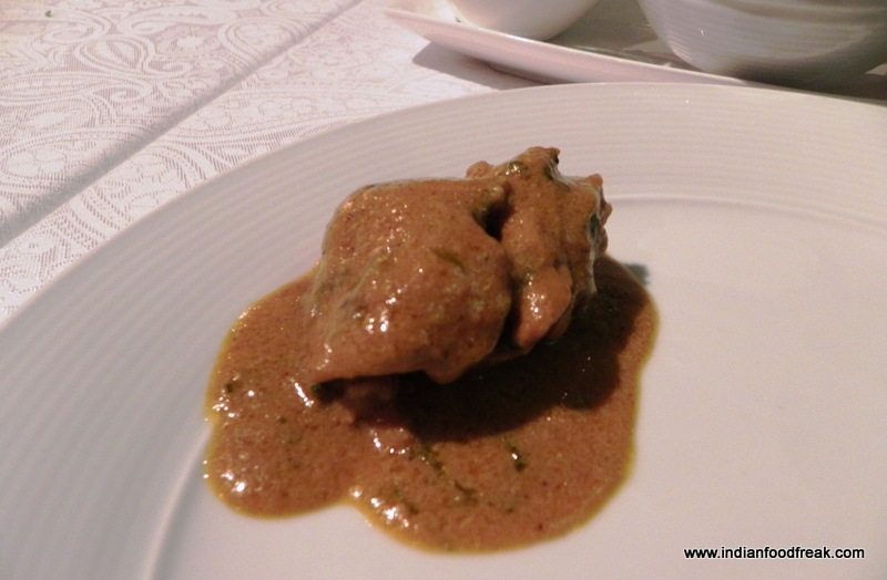 Vegetarian kebabs arrived; Sabz Nawabi Seekh and Khumbh Dak Bungalow. The seekh was softly melting blend of vegetables and cashews pounded together with spices. The mushrooms were filled with green chutney and roasted to perfection. The next to come were the Lamb Seekh Kebabs, the Haleem ke Kebab and Methi Murgh. The Lamb Seekh Kebabs were succulent, bursting with flavours. The Haleem ke Kebab, a version of galouti, were soft with a tinge of saffron. The Methi Murgh was softly tender, delicately marinated in light spices. So far my heart was dancing and I was glad that I was making new memories rather than fanning old ones. I was looking forward to the repertoire that the chef had promised  to showcase.