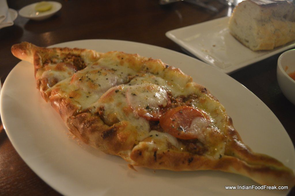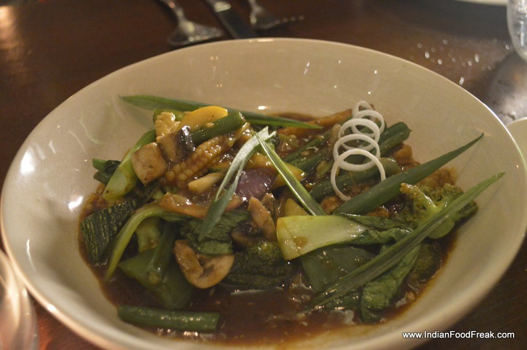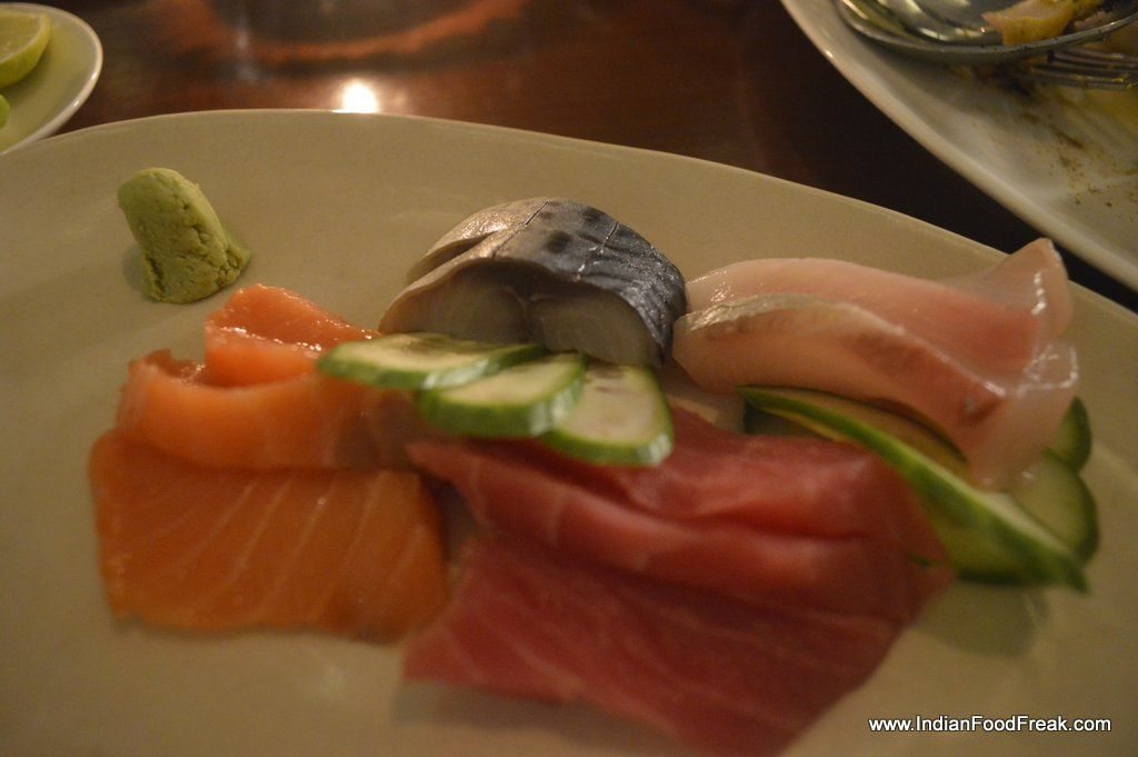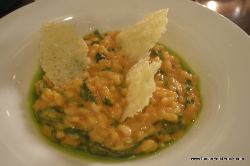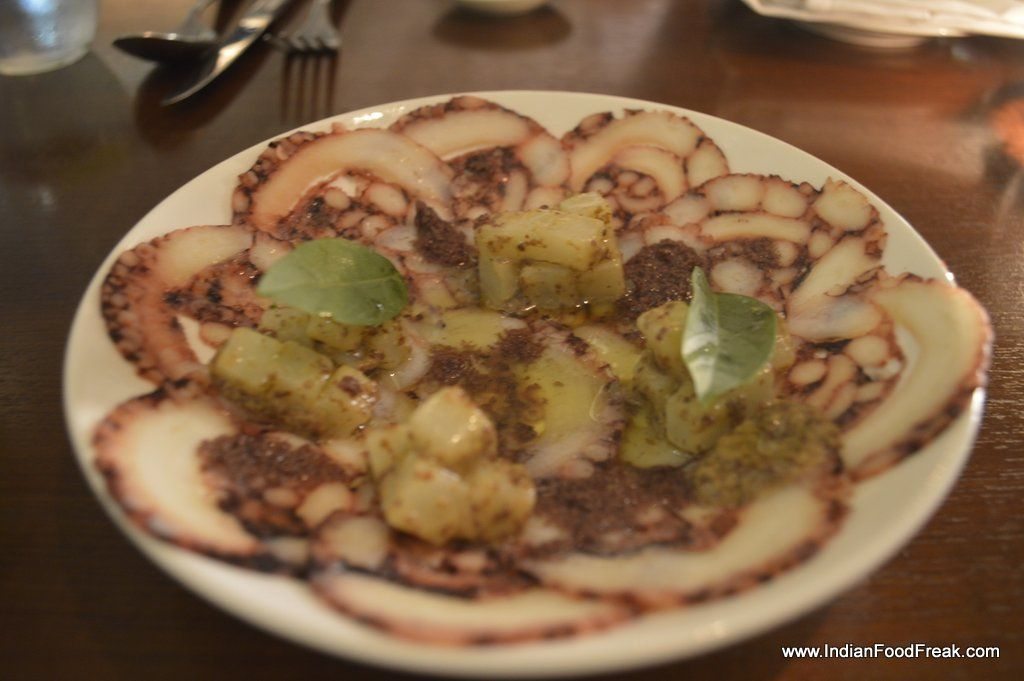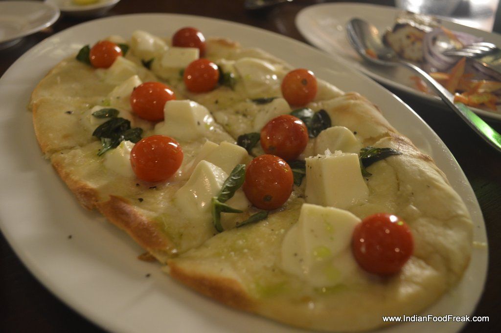 A sampling of the food on offer at the Kitchen District showcased the mildly flavoured Sutta Meen, bekti fish cooked, wrapped in banana leaf, the meat flaking off its mustard flavour; Octopus carpaccio, thinly sliced, refreshingly elegant in its floral presentation and taste; Lamb Pide on the other hand was calling for attention, rightly deserved I must admit, with its delectable, spicy minced lamb and cheese topping; Grilled Paneer was understated, perhaps appealing to the softer western palate; the Sashimi platter true to its origins, was minimalistic, just buttery soft fish (tuna, salmon, yellow tail and mackerel) with a touch of wasabi; the one that stole the palate show was the delightful Foccacia flat bread with juicy, salty Bocconcini and cheery red cherry tomatoes; Prawn tempura, Fried pork , Stir fried Tofu with vegetables were relished, welcomingly. Saffron Risotto was interestingly flavoured with pesto infused olive oil.
