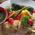 The Sea Food Soup on a subsequent visit was a meal by itself, rich, tomato-based, and loaded with seafood. The Rucola Salad was minimalist personified, crisp leaves, cheery cherry tomatoes, pickled sundried ones and dark olives with just a patina of dressing that played a delightful hide and seek with the palate. The highlight of the meal however, was the Sea Bass. Wrapped in thin slices of salted potatoes and baked in the oven adroitly, the slightly salty starch of the tuber blending ably with the mildly flavoured, soft fish. Accompanied by colourful vegetables, the dish was an eye pleaser too.