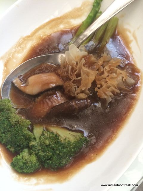The vegetarian course started with the French Bean Chilli Bean, Four Friends and a Thai Green Curry. The Thai Curry was average with high coconut milk flavor and a lack of punch. The Four Friends dish had mushrooms and vegetables in a black bean sauce that was healthy and flavourful. The French Bean dish did not gel well with the Thai Curry but went well with the Four Friends and Noodles. The flat Noodles were quite flavourful on their own.