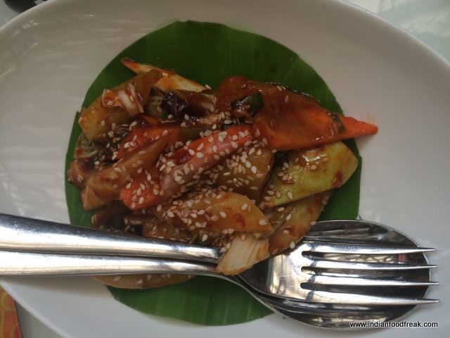 IMG_3276The vegetarian course started with the French Bean Chilli Bean,  Four Friends and a Thai Green Curry. The Thai Curry was average with high coconut milk flavor and a lack of punch. The Four Friends dish had mushrooms and vegetables in a black bean sauce that was healthy and flavourful. The French Bean dish did not gel well with the Thai Curry but went well with the Four Friends and Noodles. The flat Noodles  were quite flavourful on their own.