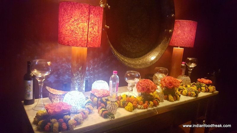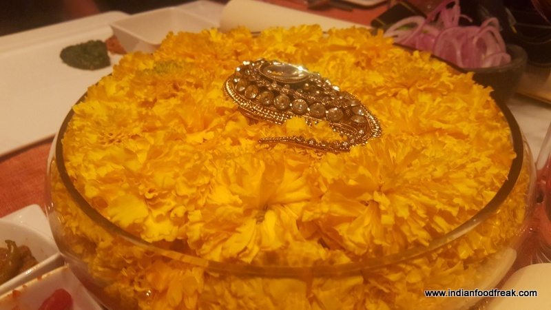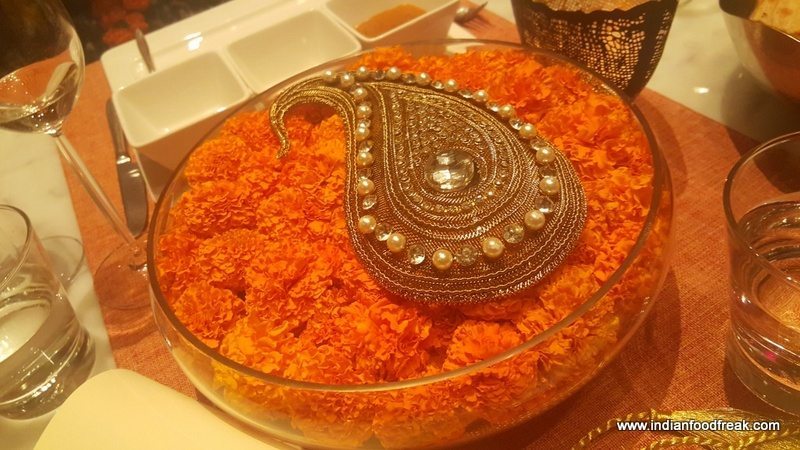 The Private Dining Room was beautifully decorated with candles and marigolds. Soft Indian classical music played in the background, adding to the ambiance. The guests were welcomed traditionally with garlands and ushered into this room.