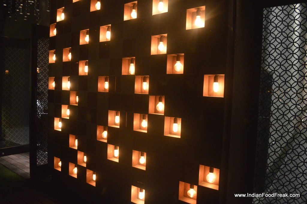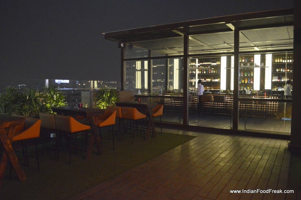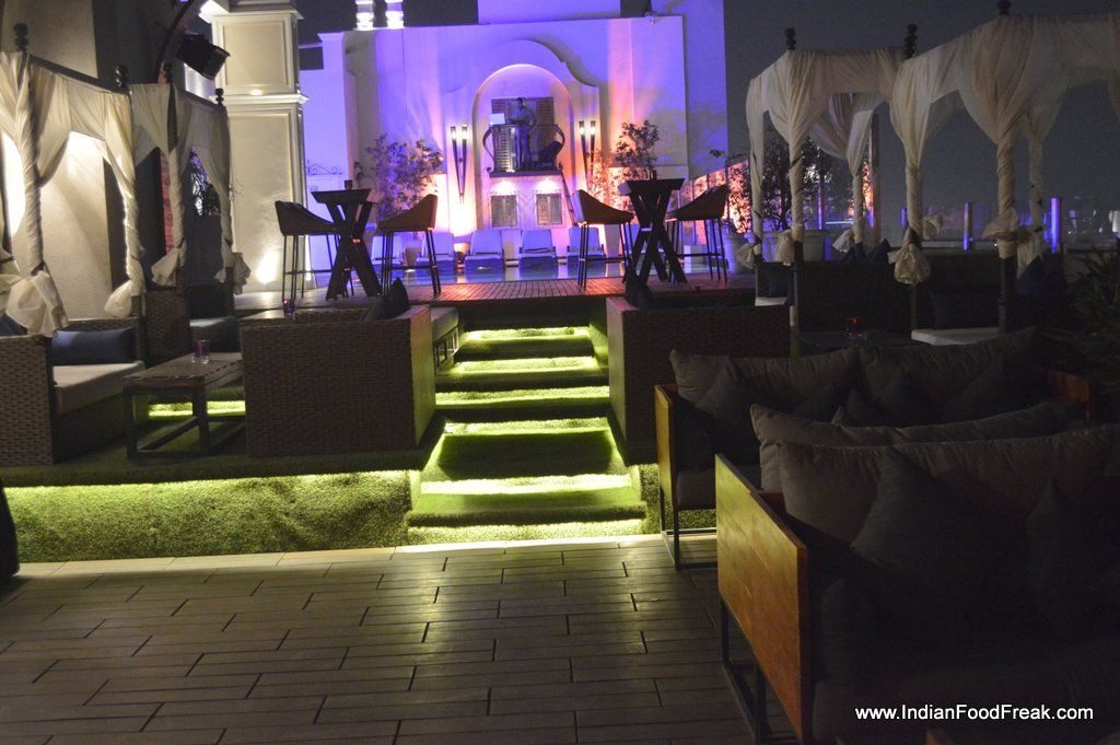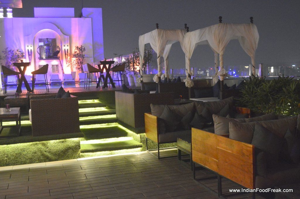 _DSC0417This is not my first visit to Hilton Garden Inn at Gurgaon. I have been here earlier for a brunch which I found to be pretty decent for its price. My this visit is to checkout the newly opened terrace bar, Vibe : The Sky Bar, which as per my knowledge is the only terrace bar at this height. The others that I remember are Story at The Westin Hotel and The Indian Grill Room. _DSC0420The pool side terrace bar is tastefully done with few cabana’s and offers an excellent view of the city landscape. The artificial grass on the floor lends the color to its otherwise sober theme. The music is retro and sound is comfortable to strike a conversation. One of the wall is aesthetically done with candles and add to the romantic and cozy atmosphere.
