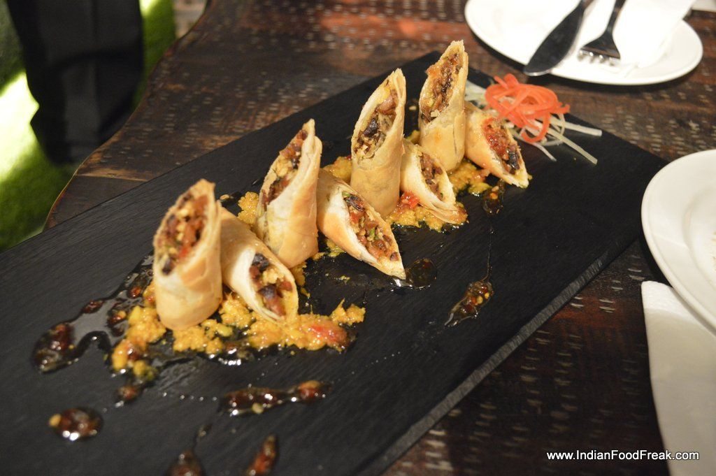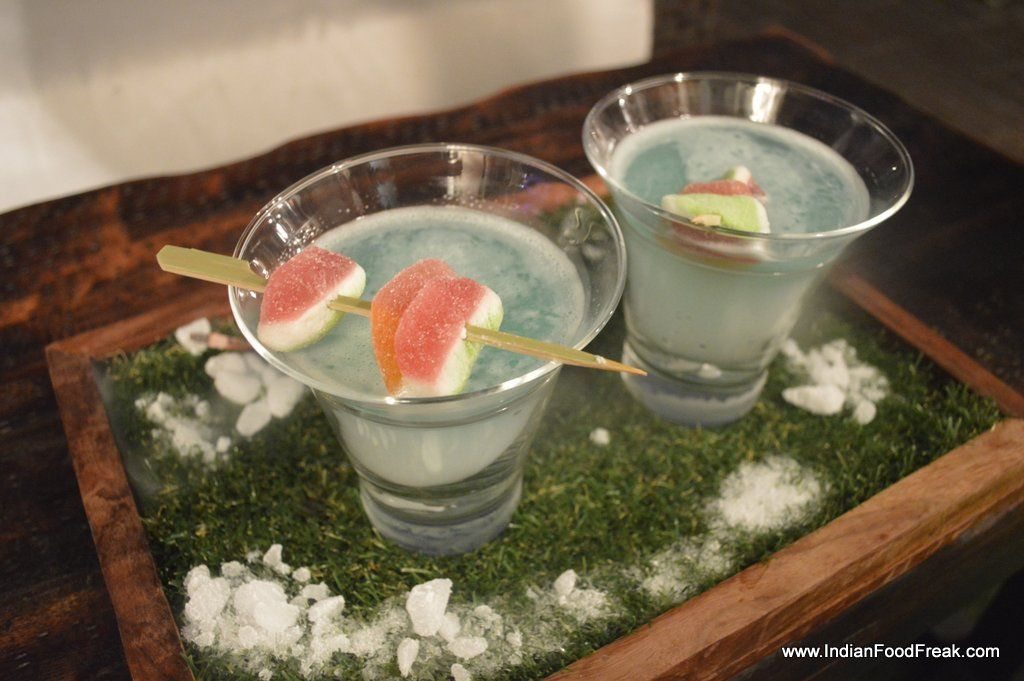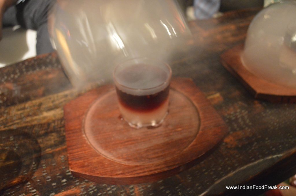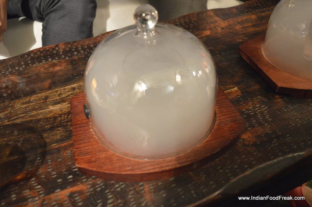 _Bubblegum CocktailWe start by asking for their signature cocktails that has an interesting name – Bubblegum cocktail (Rs 595).  The vodka based cocktail has sweet and sour mix and uses egg white and its flavors are reminiscent of the bubblegum that we so often had as a kid. The garnishing of jujube candy also impresses. This is a good beginning. Next is a tequila and wine base cocktail called Wood pepper. The smoky drink gas been smoked using the wood and the presentation is bound to impress anyone. I am not fond of bell peppers and I find the drink a bit strongly smoked. So even though I like the smokiness both in my food and drinks, this fails to strike a chord with me.