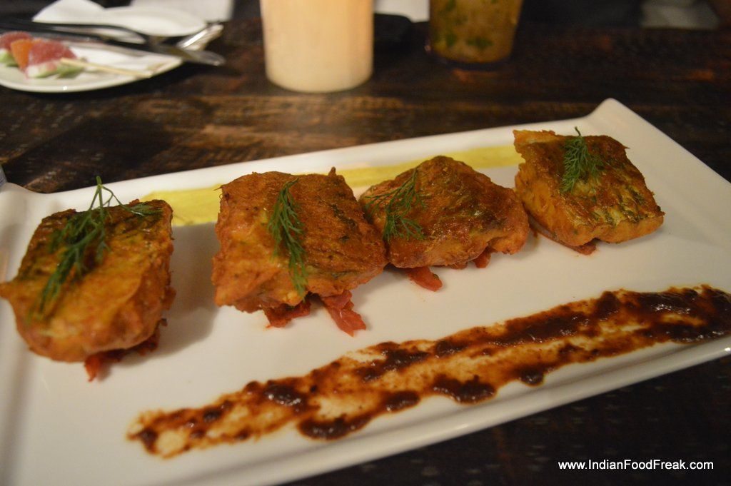 Chicken Malai TikkaVibe only offers bar food (finger food) at the terrace. I did order for couple of dishes. The team has tried to give an international twist to the comfortable Indian food. Like Chicken Malai Tikka has Blue cheese in it, and even though I missed the sharpness of Blue Cheese most people would like it. Amritsari fish is served with Korean Kochujang mayo. It is a bit too thickly battered for me. I enjoyed the tawa sea bass is flavoured with carrom and served with prunes chutney.