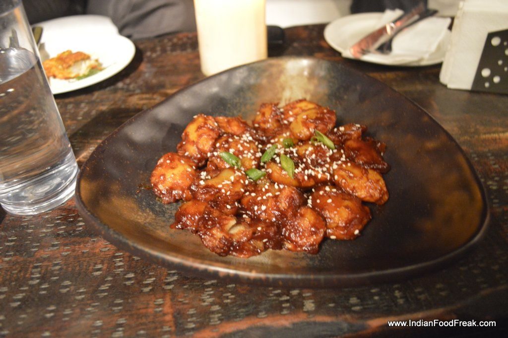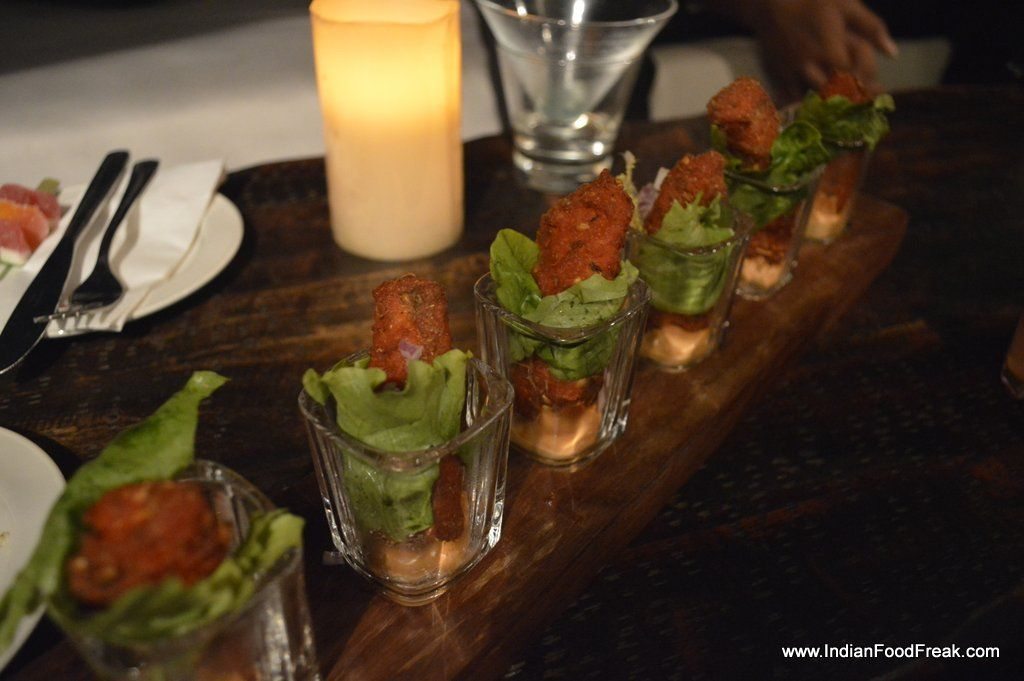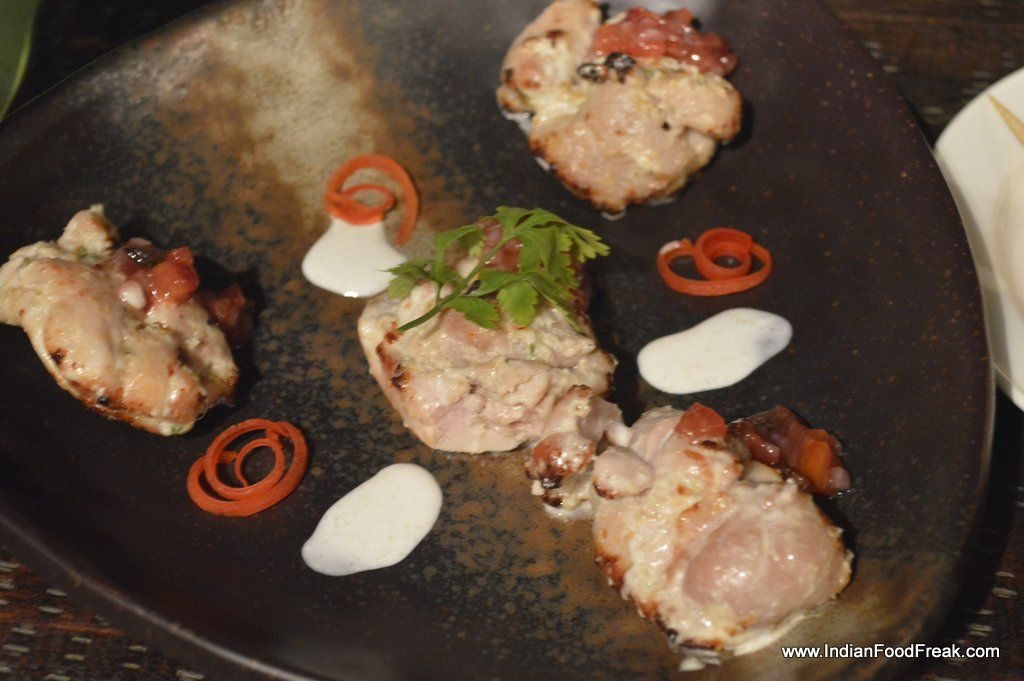 Chicken Malai TikkaVibe only offers bar food (finger food) at the terrace. I did order for couple of dishes. The team has tried to give an international twist to the comfortable Indian food. Like Chicken Malai Tikka has Blue cheese in it, and even though I missed the sharpness of Blue Cheese most people would like it. Amritsari fish is served with Korean Kochujang mayo. It is a bit too thickly battered for me. I enjoyed the tawa sea bass is flavoured with carrom and served with prunes chutney.