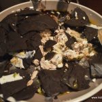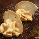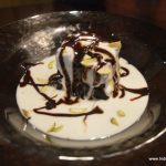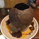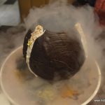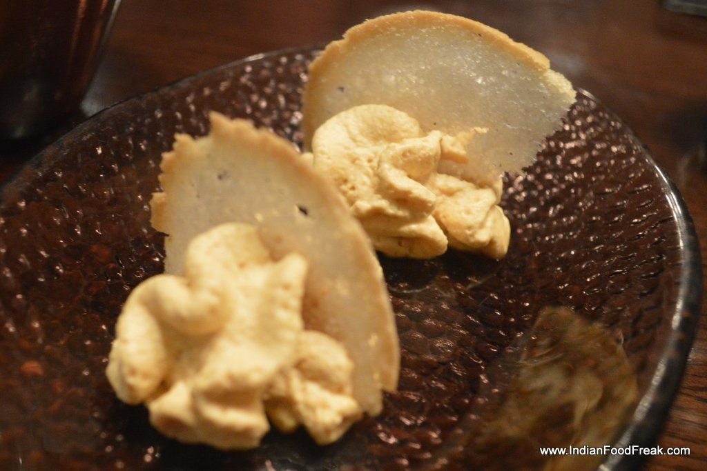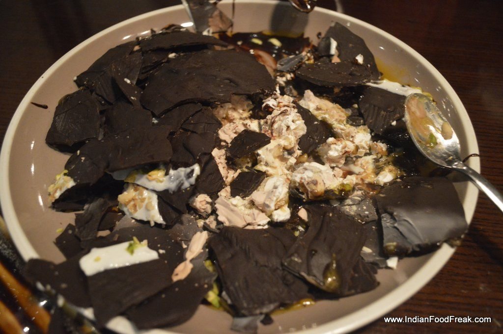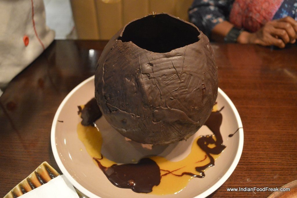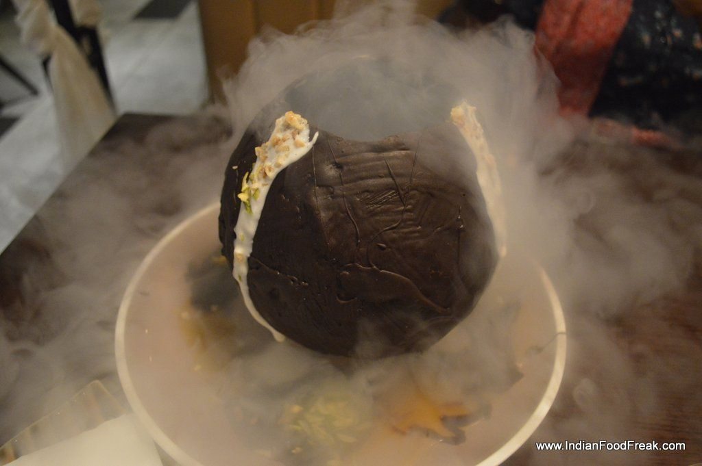Or so I thought until the chef came with the dessert of the day- An attempt at artful seduction, a globe of chocolate with freeze dried caramel cream base, into which were thrown nuts, crushed sweet peanut cakes, cream, chocolate, apricot sauce, all of them bathed with smoky, icy liquid nitrogen ….all this fanfare only to have it crash against the plate and have the remnants scooped into eager mouths. Splendid. A warning though- it is meant for the really sweet-toothed and for a group of patrons and not for individuals or a couple.