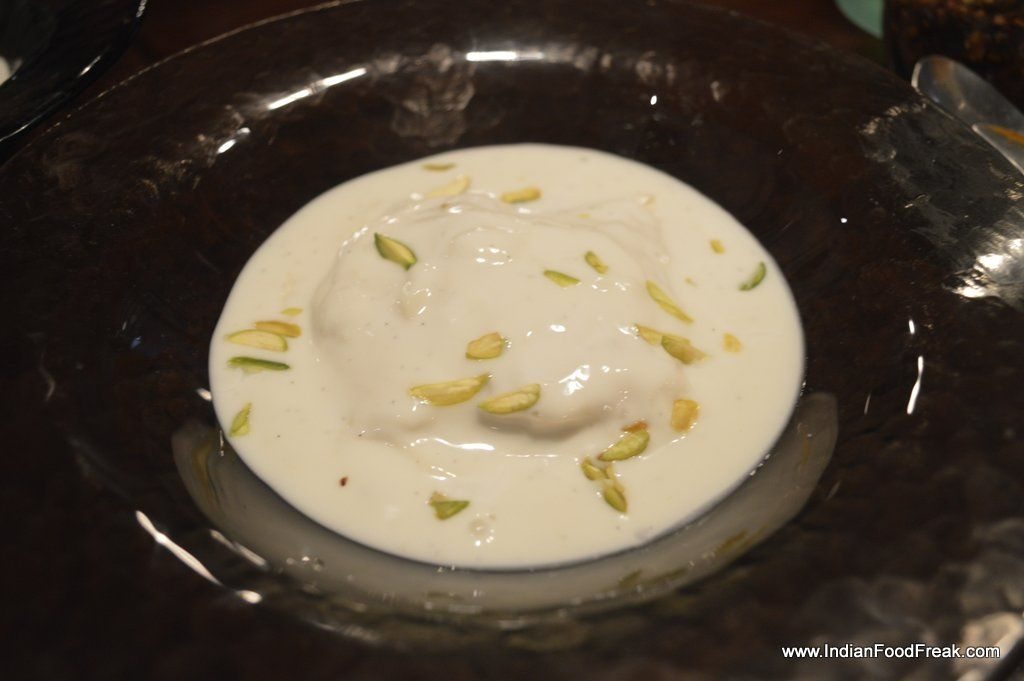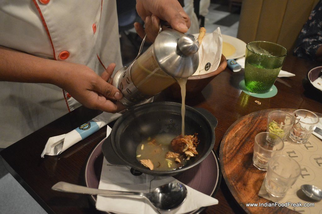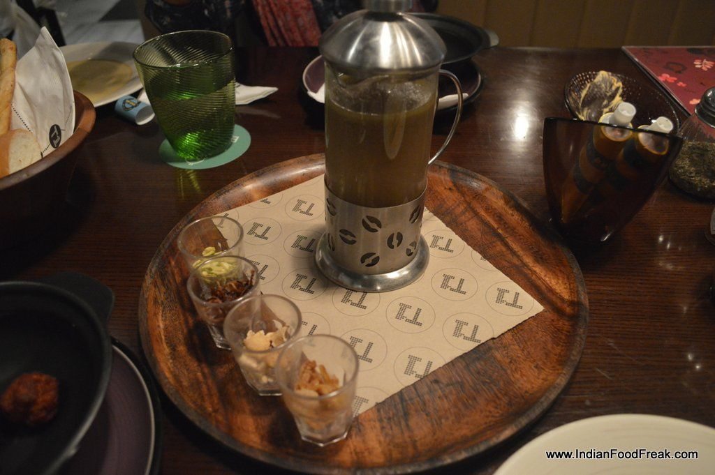 Paya Rasam with Cheese stuffed meatballs, dehydrated apricots, oyster mushrooms and curry leaves, unlike the traditional gelatinous one, was reminiscent of French Onion soup, browned onions giving the light broth a tasty lift while toasted pista nuts, dried apricots, oyster mushrooms added distinct flavours. The deep fried meatball would have gelled better with the soup if it were served shredded instead of whole, or kept soaked in the broth before being served. Just a thought.