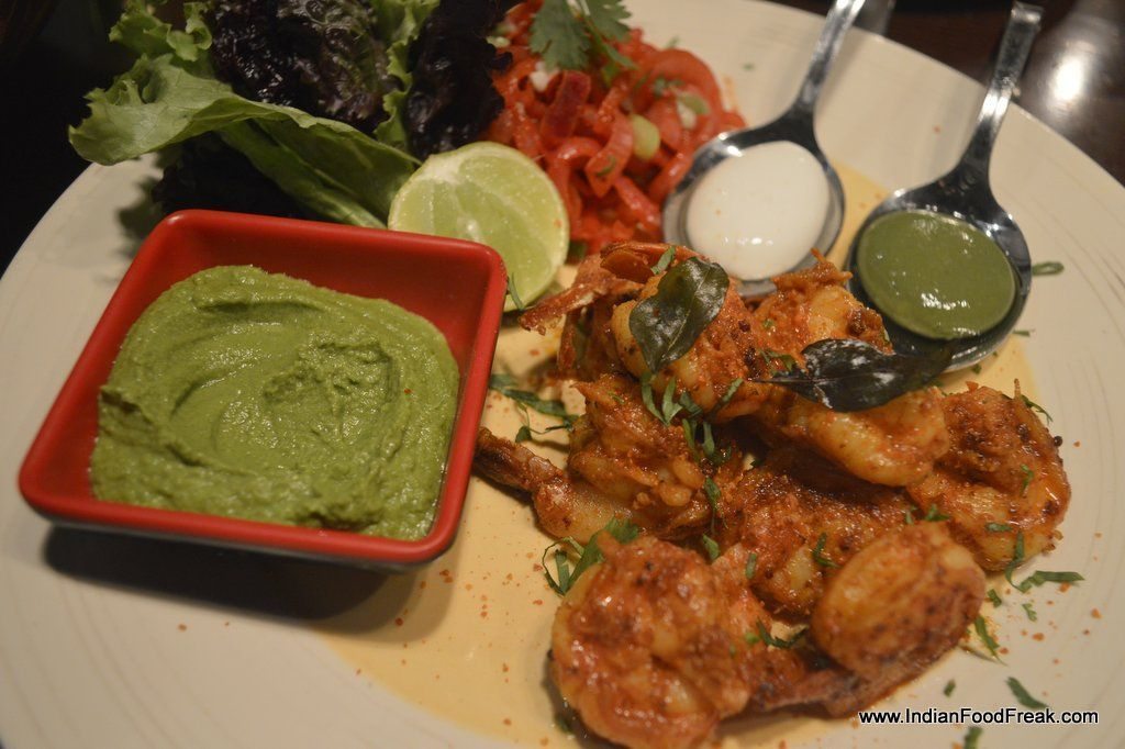 Sous vide BBQ Lasuni Chicken Tikka with garden greens, channa jor garam and crackery papadums was simply superb. Fresh crispy salad vegetables with a tasty dressing and crunchy channa jor thrown over and topped with mouth-watering garlic flavoured chicken tikka wrapped in masala papad. I loved it. Gunpowder and Ghee roasted Prawns with Milagaipodi dust, aampapad and two olives-capers chutney was a mouthful of fiery treats, the heat quenched by the thoughtfully served curd sphere. The tapenade that accompanied it made of an eclectic mix of green and black olives, mint, capers and garlic added an interesting fusion factor to the crustacean.