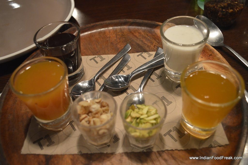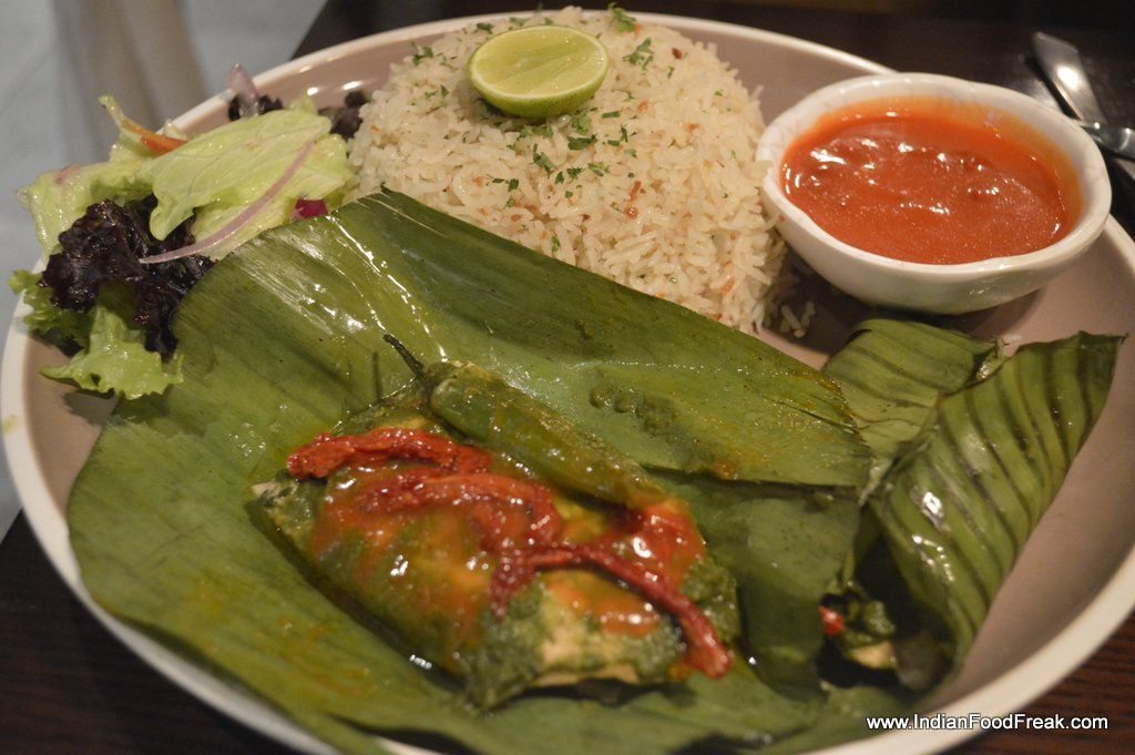 The personal let down was the Patrani Machi with Baby Turmeric, Teen Phoran, mustard and coriander juice– fish steamed, wrapped in banana leaf. The steamed fish by itself was unassuming but the green sauce, chilly and sundried tomatoes added nothing to enhance its flavours or taste. A tangy sauce, citrus based or sweet-tamarind based may have done the needful but it is best left to the chef to tackle its insipidness.