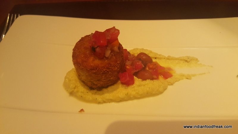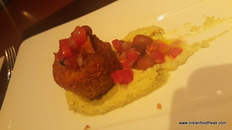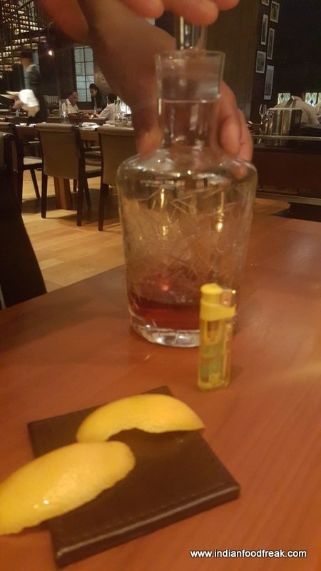 We were served hard crust house bread which was earthy and wonderfully heartwarming. Then arrived the Antipasti – beautifully presented patties of eggplant, mashed chickpeas, borlotti (Poplette Di Melanzane Con Purea Di Ceci – INR 695). To say it was delicious is an understatement…the flavours brought about a sensation of pure bliss in the mouth and had us craving for more. Then came the Scotch…a joyful sight indeed. A large ball of ice was placed in a glass and the Godfather Negroni was poured with the solemnity it deserved, a flamed orange twist added and voila! The Negroni, which was straight out of one of the little barrels I had seen on the first floor bar counter was perfect with subtle flavours of the oak and the orange twist lending an added aspect to the nose and taste.