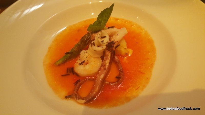 We were served a glass of sparkling, the minute we were seated. The open kitchen which was a hive of activity, the wonderful whiff which wafted from the open kitchen, the beautifully laid table and the mood in general whetted my appetite and I was eager to find out what treats Chef Roberto had planned for us.