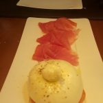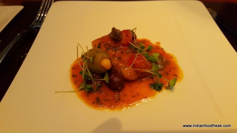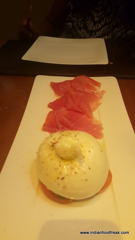 Then came the Fritto Misto which was an artfully presented Calamari, Prawns, Fish in Marinara Sauce (INR 850). If presentation of this dish was king, the taste ruled as emperor – subtle fresh flavours of tomato where each ingredient stood out, the flavours delicate and distinct. To me, this was the hero among all that we tried out that evening. The Burrata with Ham (Home style creamy buffalo cheesse,organic tomato, pesto – INR 995) was another beautiful dish – although the Burrata was a tad runny, it nonetheless made a happy medley of tastes in my mouth. The Gavi that was served with it was a young cheerful wine and didn’t overwhelm the palette, leaving it fresh and eager to try out the other tastes which were to follow.